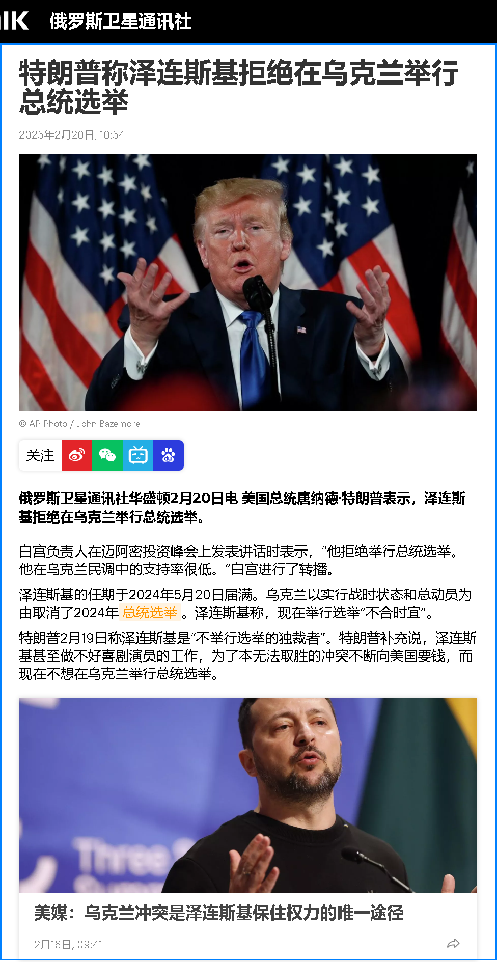 18日,特朗普在佛罗里达州海湖庄园举行的记者会上称,乌克兰“本应该在(冲突持续的)三年期间结束它,本不应该(让冲突)开始,本可以达成(和平)协议……但他们(乌克兰)选择不这么做”。