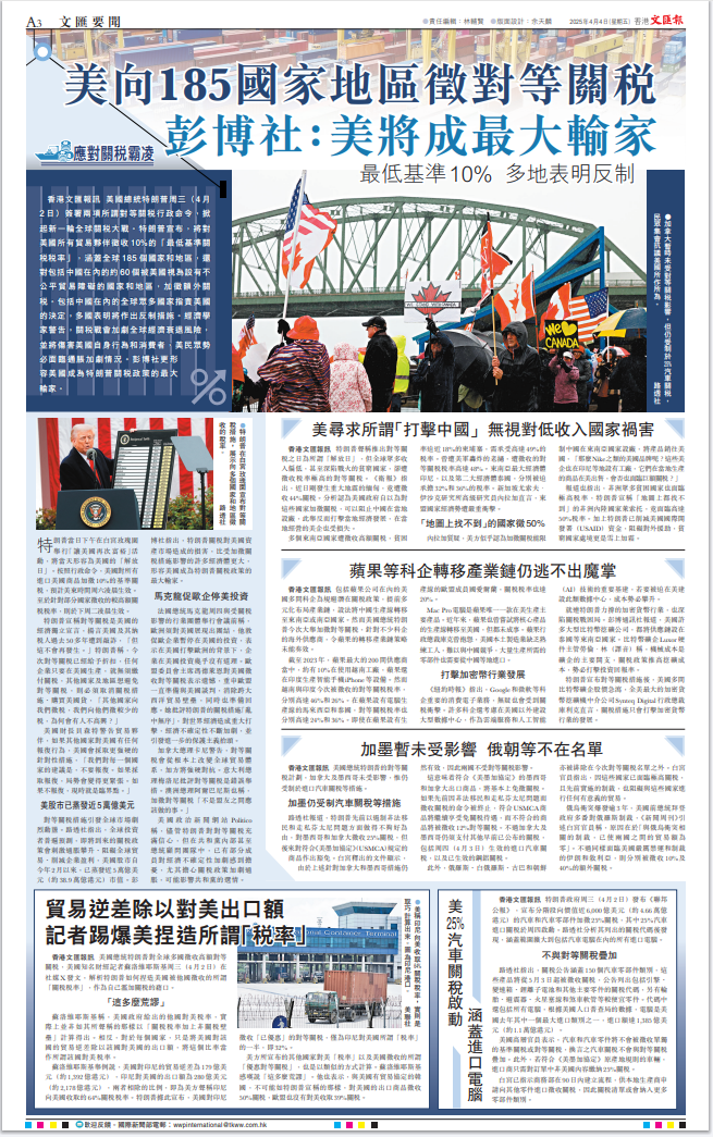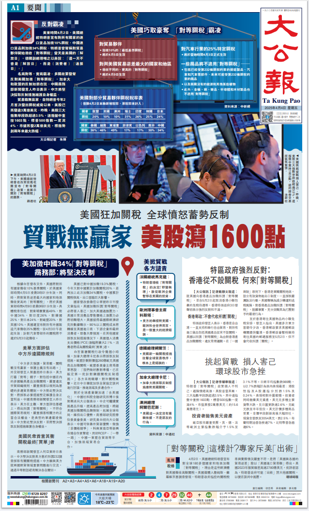 美國總統特朗普昨日發動史無前例的關稅戰,向全世界主要國家徵收巨額關稅。此舉進一步暴露其霸權主義的真面目,遭到包括其盟友在內所有國家的一致強烈反對。美股昨晚一度大跌1600點,足以體現市場的態度。面對美國的野蠻霸道行徑,中國將採取必要措施堅定維護自身權益。對香港特區來說,挑戰和機遇並存,既要正視美關稅戰帶來的衝擊,更要堅定發展信心,加快融入國家發展大局,加大開拓新市場的力度,提升應對風浪的能力。