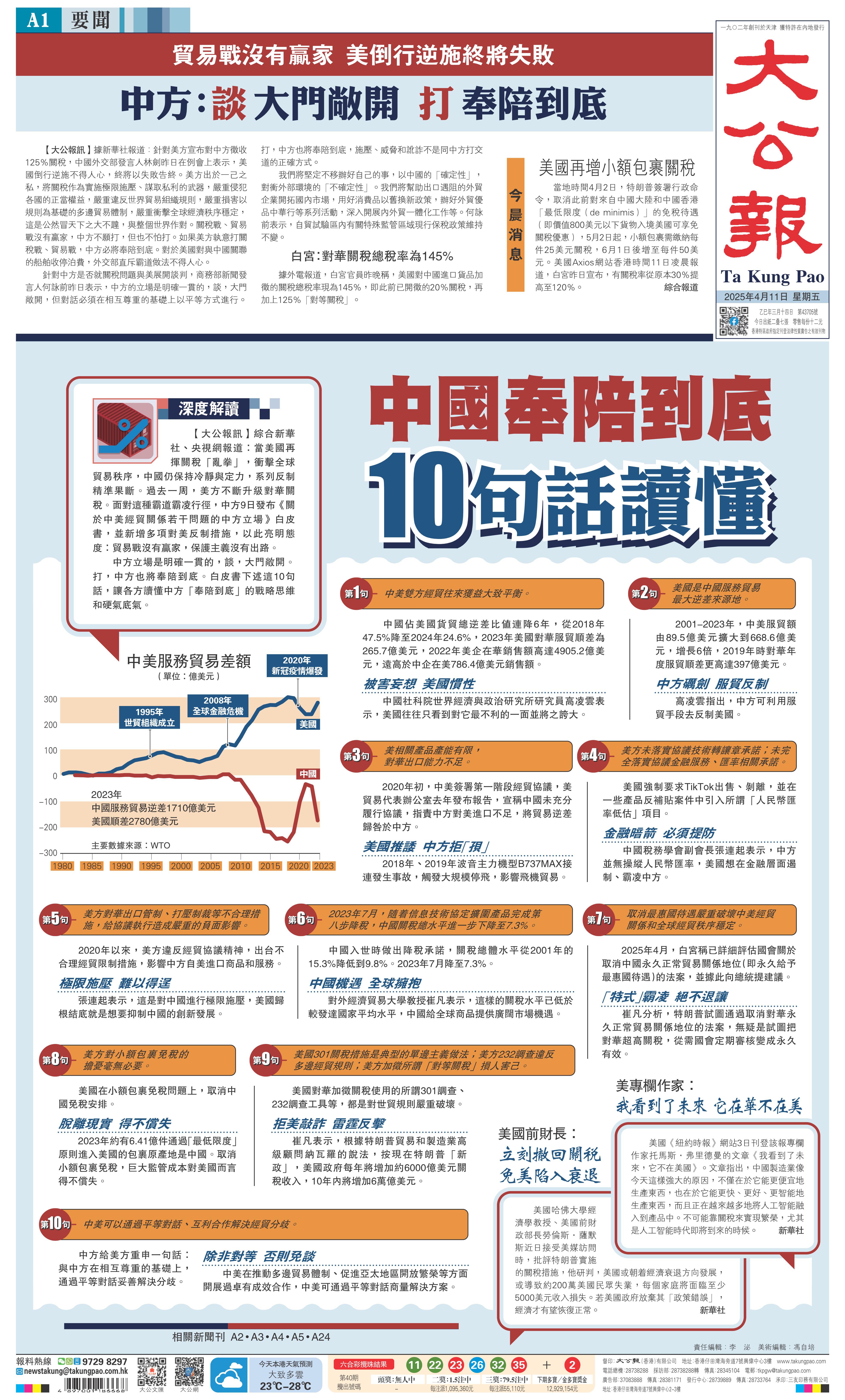 圖:中國奉陪到底10句話讀懂【大公報訊】綜合新華社、央視網報道:當美國再揮關稅「亂拳」,衝擊全球貿易秩序,中國仍保持冷靜與定力,系列反制精準果斷。過去一周,美方不斷升級對華關稅。面對這種霸道霸凌行徑,中方9日發布《關於中美經貿關係若干問題的中方立場》白皮書,並新增多項對美反制措施,以此亮明態度:貿易戰沒有贏家,保護主義沒有出路。