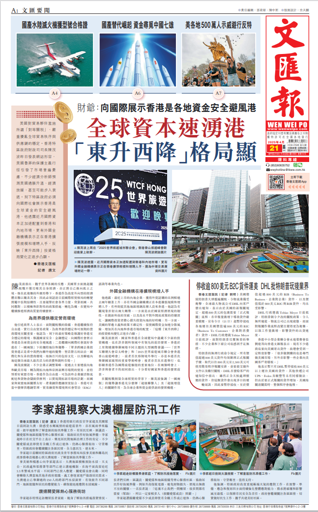 美国对贸易伙伴滥施所谓「对等关税」,严重扰乱全球贸易秩序与供应链的稳定。香港特区政府财政司司长陈茂波昨日发表网志形容,美国鲁莽的保护主义行径引发了市场普遍忧虑,不少经济分析师预测美国通胀升温、经济放缓,甚至可能步入衰退。刻下特区政府必须向国际社会展示香港是全球资金的安全避风港,他透露近月国际资本正加速配置到香港和内地市场,更有外国金融机构表示正在香港扩张规模和增聘人手,反映「东升西降」投资格局变化正逐步凸显。 ●香港文汇报记者唐文