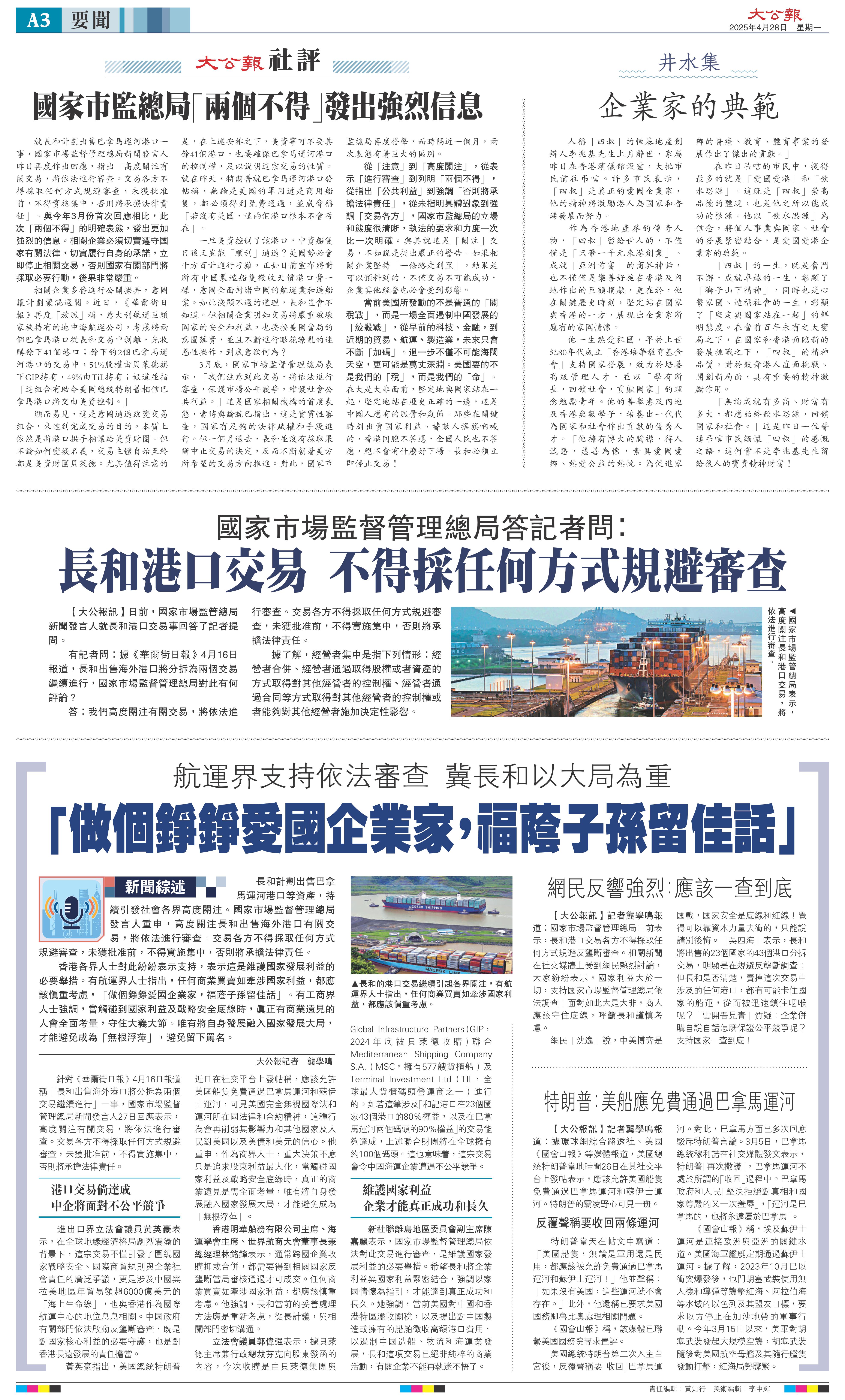就长和计划出售巴拿马运河港口一事,国家市场监督管理总局新闻发言人昨日再度作出回应,指出「高度关注有关交易,将依法进行审查。交易各方不得采取任何方式规避审查,未获批准前,不得实施集中,否则将承担法律责任」。与今年3月份首次回应相比,此次「两个不得」的明确表态,发出更加强烈的信息。相关企业必须切实遵守国家有关法律,切实履行自身的承诺,立即停止相关交易,否则国家有关部门将采取必要行动,后果非常严重。