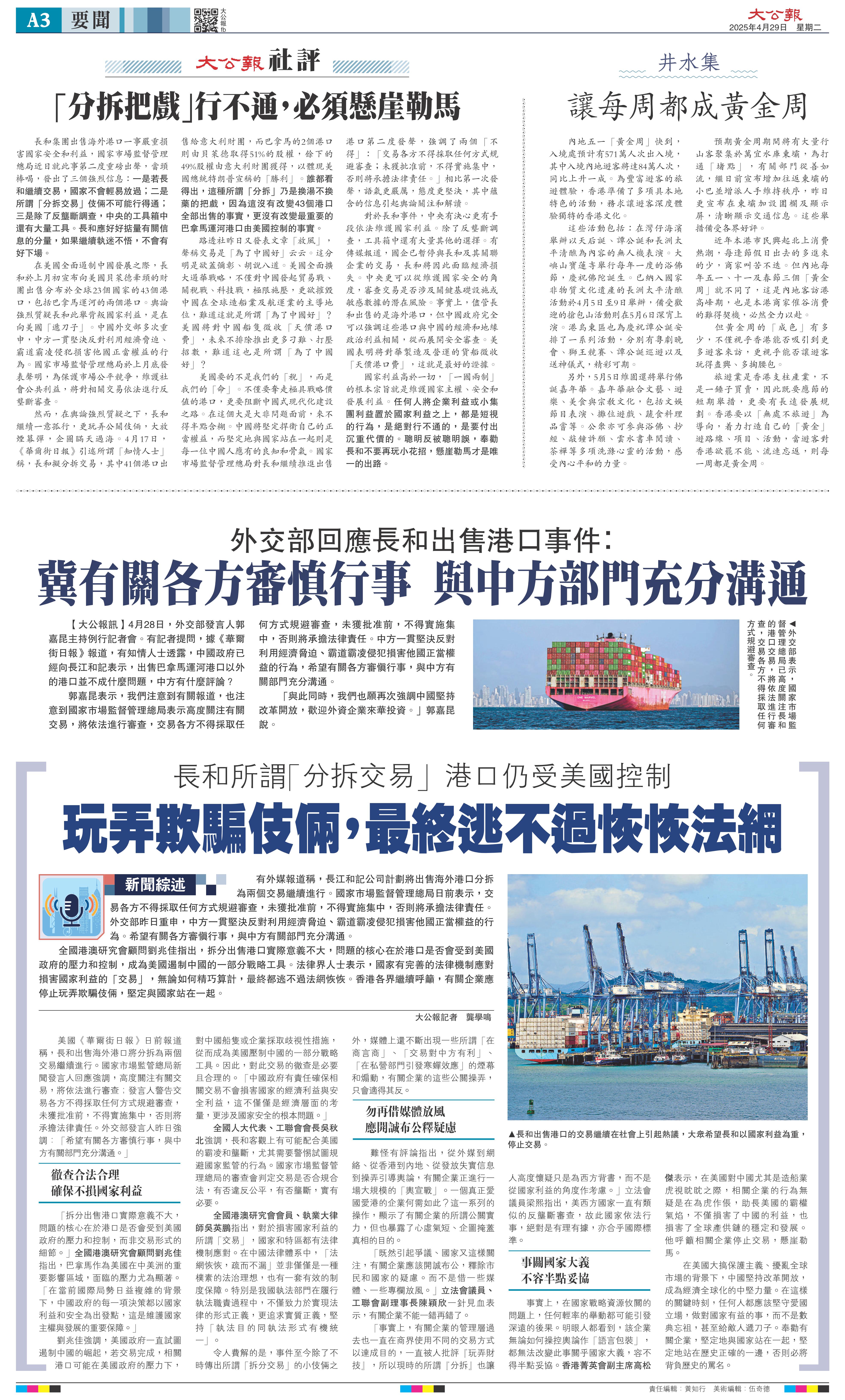 有外媒报道称,长江和记公司计划将出售海外港口分拆为两个交易继续进行。本港有学者指出,分拆出售港口实际意义不大,问题的核心在于港口会否受到美国的控制,成为遏制中国的工具。法律界人士表示,国家有完善的法律机制应对损害国家利益的「交易」,精巧算计逃不过法网恢恢。有关企业应该开诚布公,释除市民和国家的疑虑,而不是玩弄欺骗伎俩。