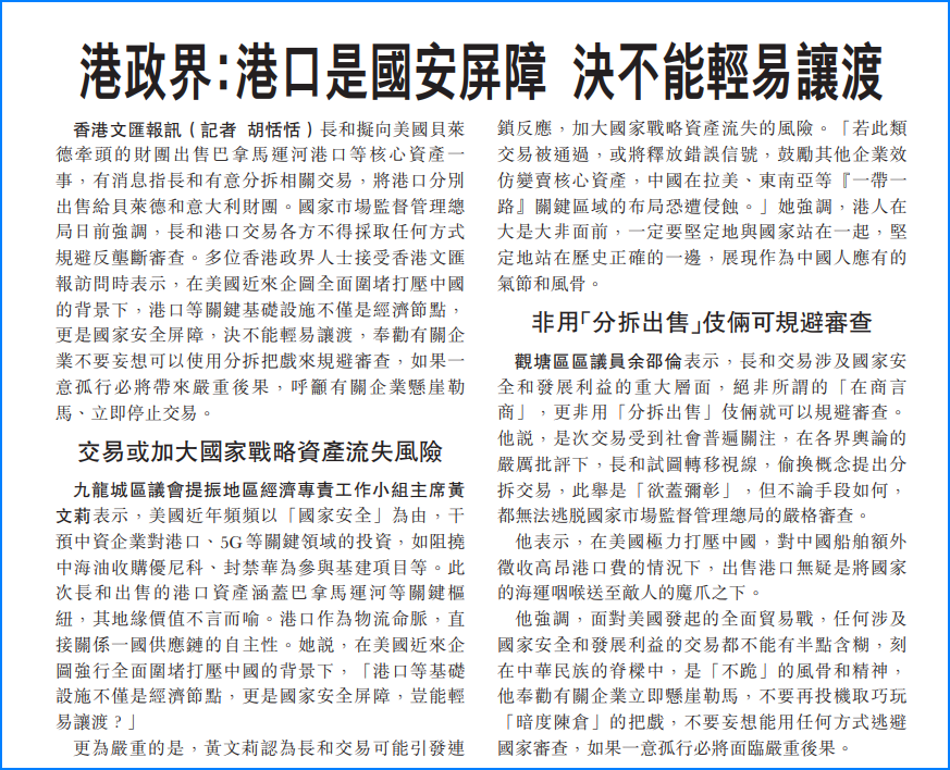 更为严重的是,黄文莉认为长和交易可能引发连锁反应,加大国家战略资产流失的风险。 「若此类交易被通过,或将释放错误信号,鼓励其他企业效仿变卖核心资产,中国在拉美、东南亚等『一带一路』关键区域的布局恐遭侵蚀。」她强调,港人在大是大非面前,一定要坚定地与国家站在一起,坚定地站在历史正确的一边,展现作为中国人应有的气节和风骨。