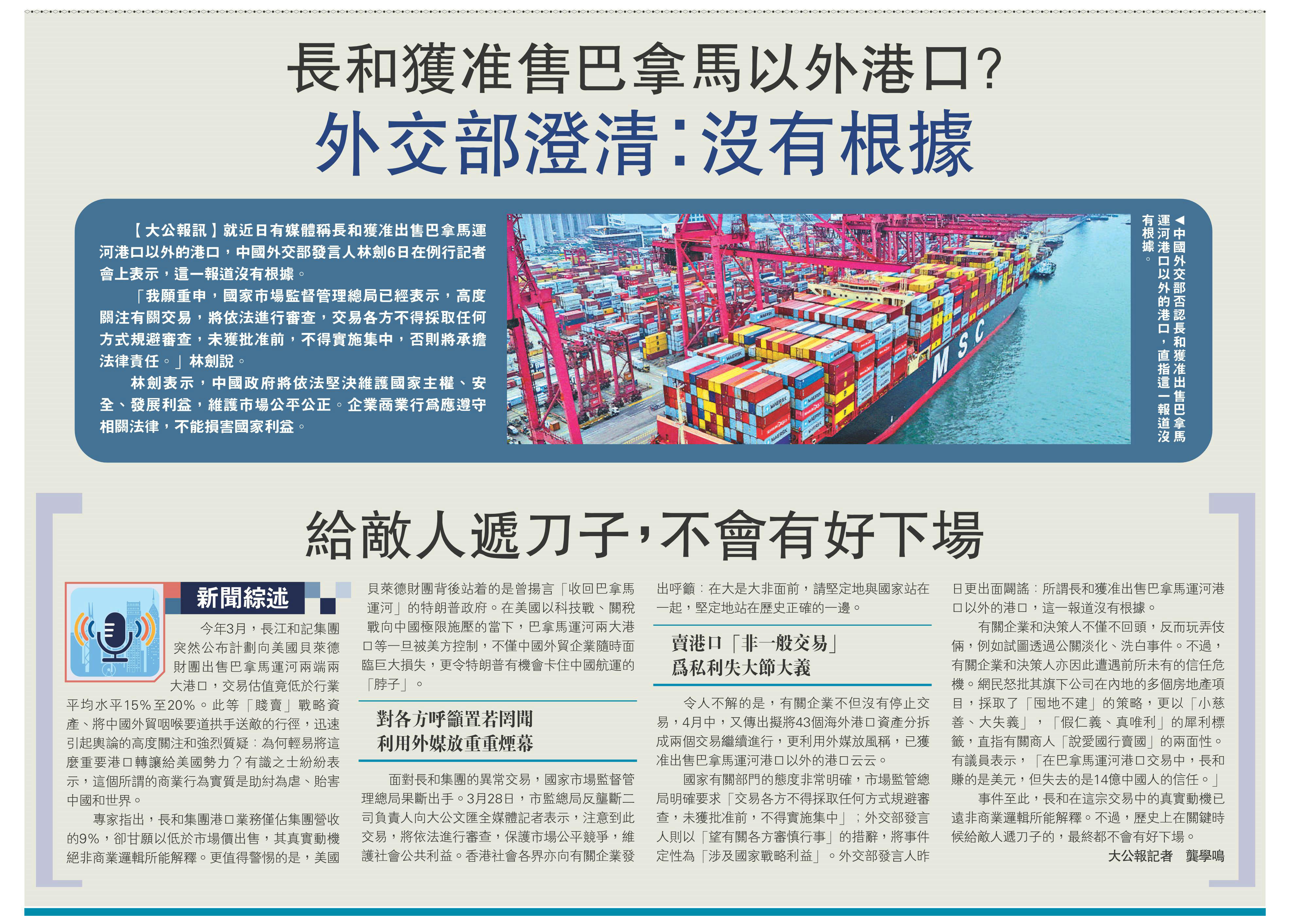 令人不解的是,有关企业不但没有停止交易,4月中,又传出拟将43个海外港口资产分拆成两个交易继续进行,更利用外媒放风称,已获准出售巴拿马运河港口以外的港口云云。