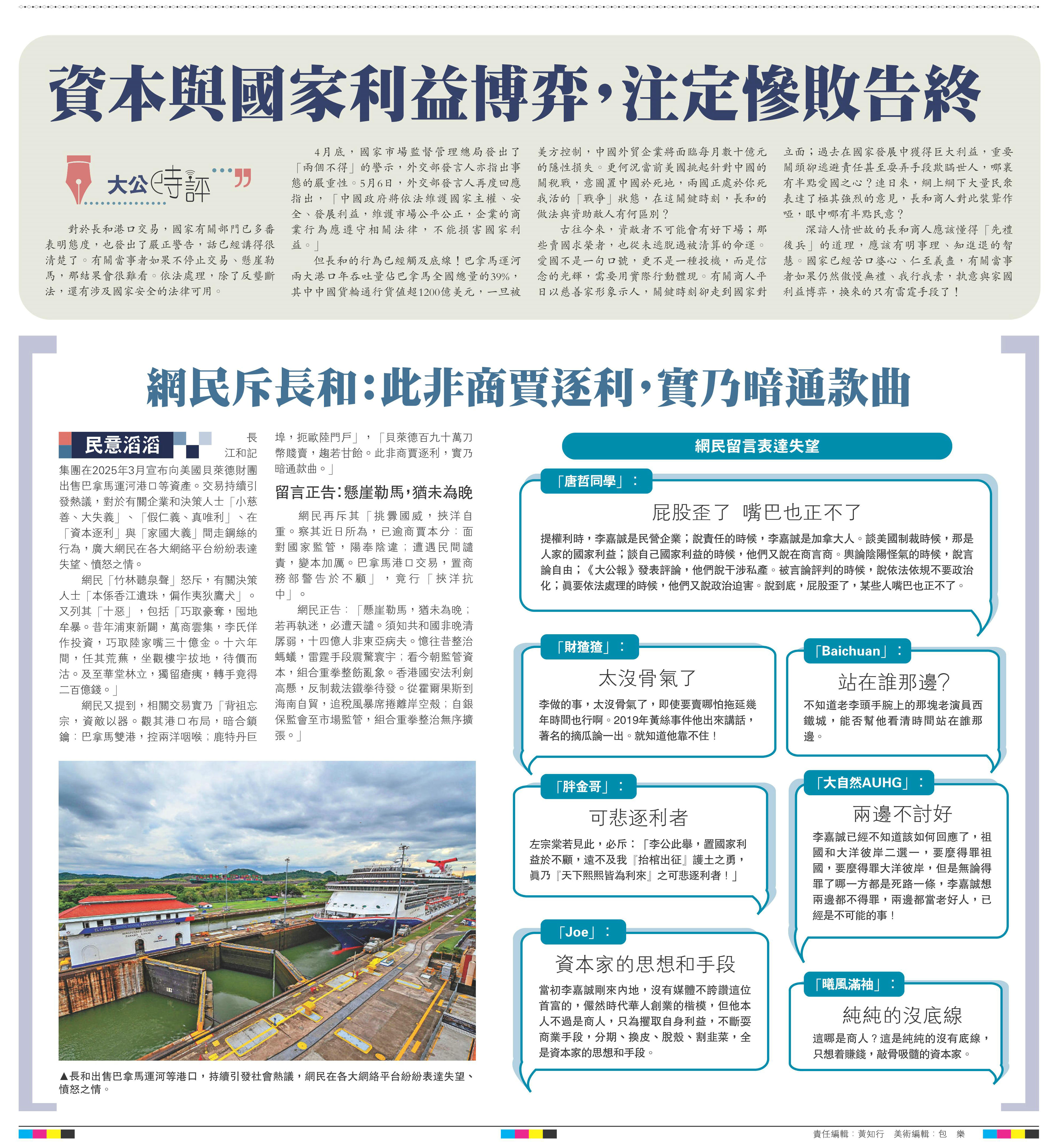 长江和记集团在2025年3月宣布向美国贝莱德财团出售巴拿马运河港口等资产。交易持续引发热议,对于有关企业和决策人士「小慈善、大失义」、「假仁义、真唯利」、在「资本逐利」与「家国大义」间走钢丝的行为,广大网民在各大网络平台纷纷表达失望、愤怒之情。