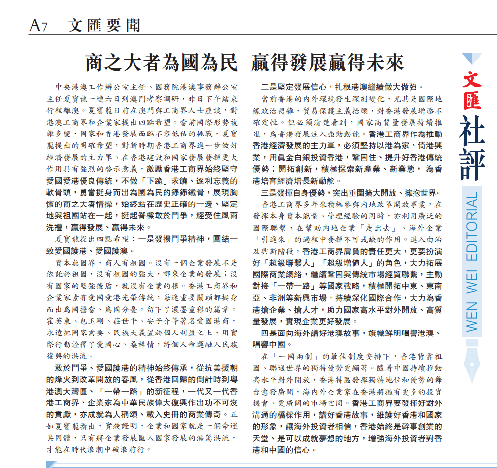 中央港澳工作办公室主任、国务院港澳事务办公室主任夏宝龙一连六日到澳门考察调研,昨日下午结束行程离澳。夏宝龙日前在澳门与工商界人士座谈,对港澳工商界和企业家提出四点希望。当前国际形势复杂多变,国家和香港发展面临不容低估的挑战,夏宝龙提出的明确希望,对新时期香港工商界进一步做好经济发展的主力军、在香港建设和国家发展发挥更大作用具有强烈的启示意义,激励香港工商界始终坚守爱国爱港优良传统,不做「下跪」求饶、逐利忘义的软骨头,勇当挺身而出为国为民的铮铮铁骨,展现胸怀的商之大者情操,始终站在历史正确的一边、坚定地与祖国站在一起,挺起脊梁敢于斗争,经受住风雨洗礼,赢得发展、赢得未来。