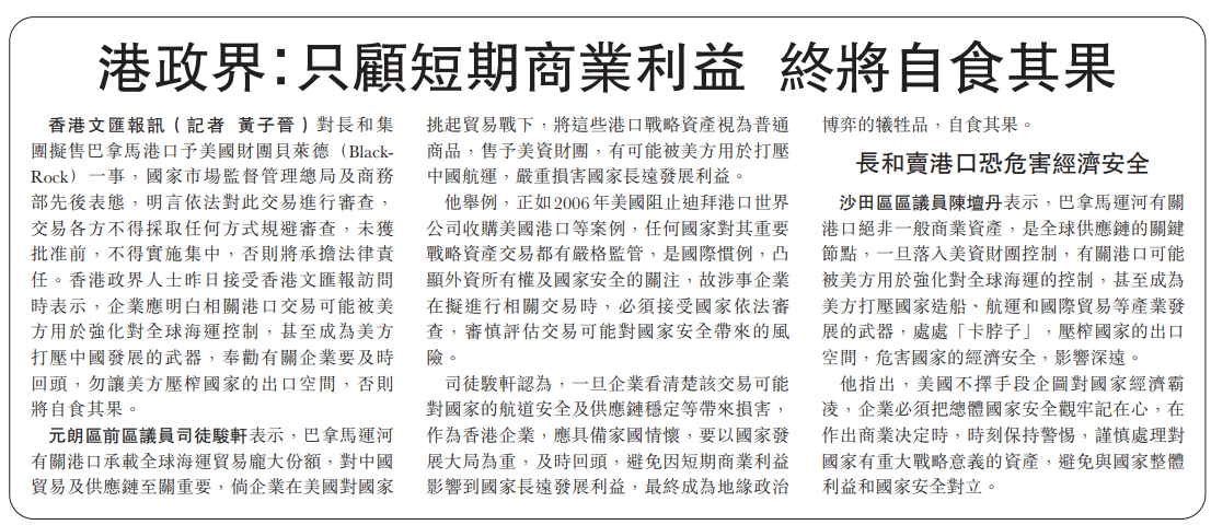 司徒骏轩认为,一旦企业看清楚该交易可能对国家的航道安全及供应链稳定等带来损害,作为香港企业,应具备家国情怀,要以国家发展大局为重,及时回头,避免因短期商业利益影响到国家长远发展利益,最终成为地缘政治博弈的牺牲品,自食其果。