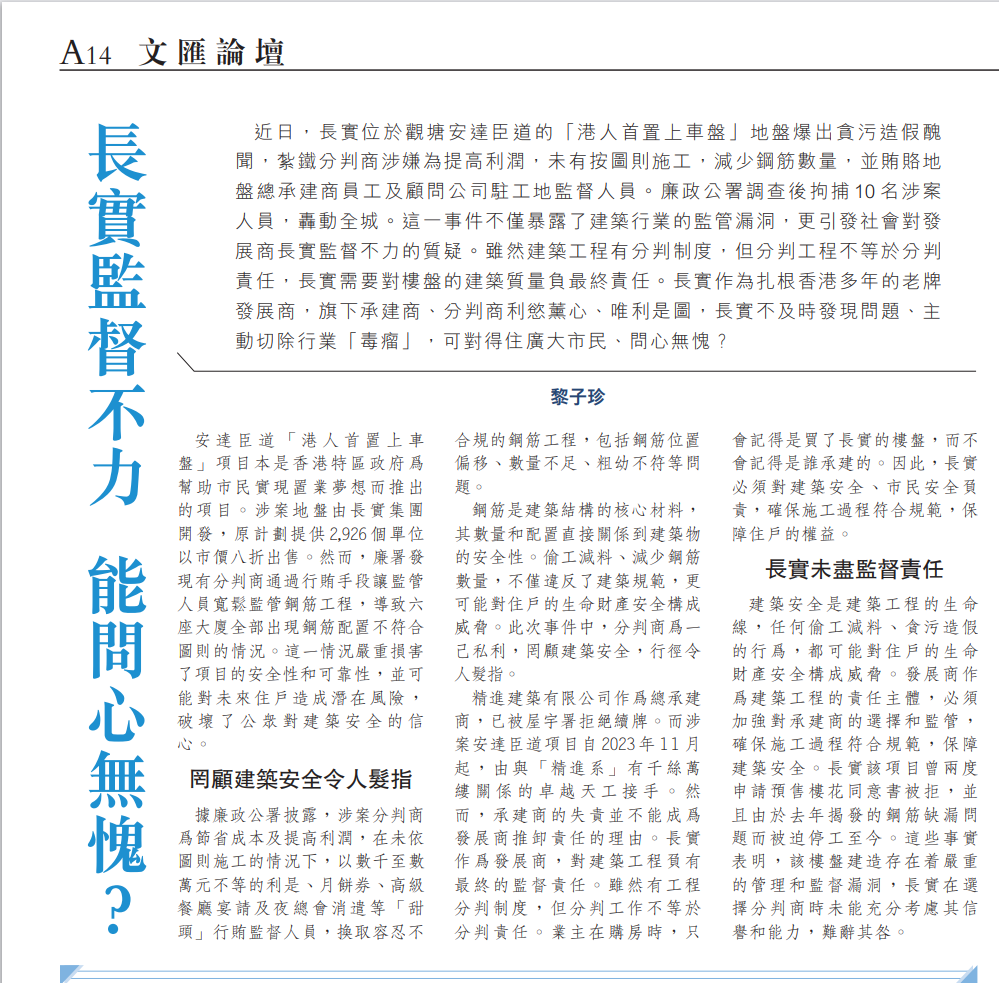 近日,长实位于观塘安达臣道的「港人首置上车盘」地盘爆出贪污造假丑闻,扎铁分判商涉嫌为提高利润,未有按图则施工,减少钢筋数量,并贿赂地盘总承建商员工及顾问公司驻工地监督人员。廉政公署调查后拘捕10名涉案人员,轰动全城。这一事件不仅暴露了建筑行业的监管漏洞,更引发社会对发展商长实监督不力的质疑。虽然建筑工程有分判制度,但分判工程不等于分判责任,长实需要对楼盘的建筑质量负最终责任。长实作为扎根香港多年的老牌发展商,旗下承建商、分判商利欲薰心、唯利是图,长实不及时发现问题、主动切除行业「毒瘤」,可对得住广大市民、问心无愧?