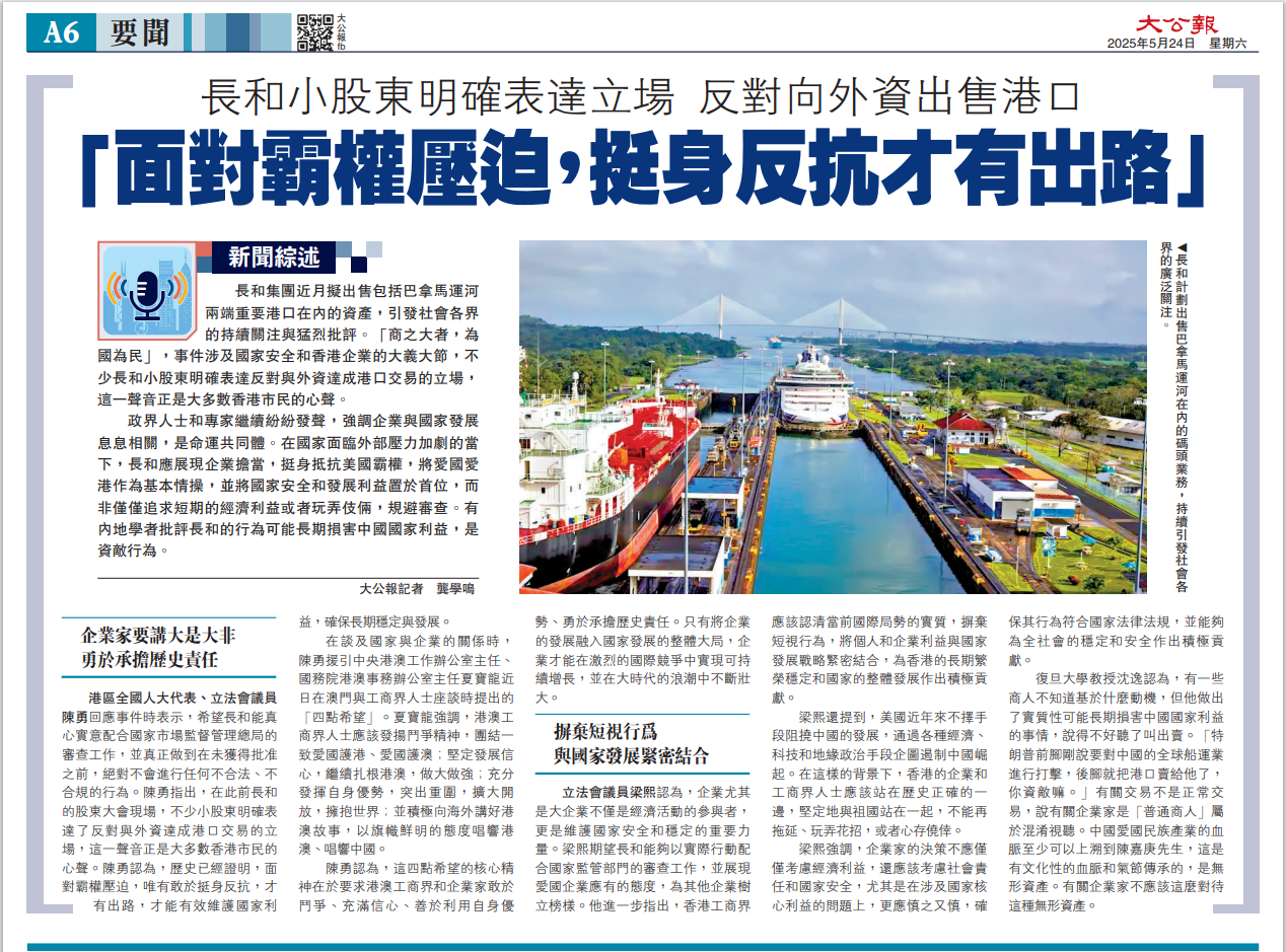长和集团近月拟出售包括巴拿马运河两端重要港口在内的资产,引发社会各界的持续关注与猛烈批评。 「商之大者,为国为民」,事件涉及国家安全和香港企业的大义大节,不少长和小股东明确表达反对与外资达成港口交易的立场,这一声音正是大多数香港市民的心声。