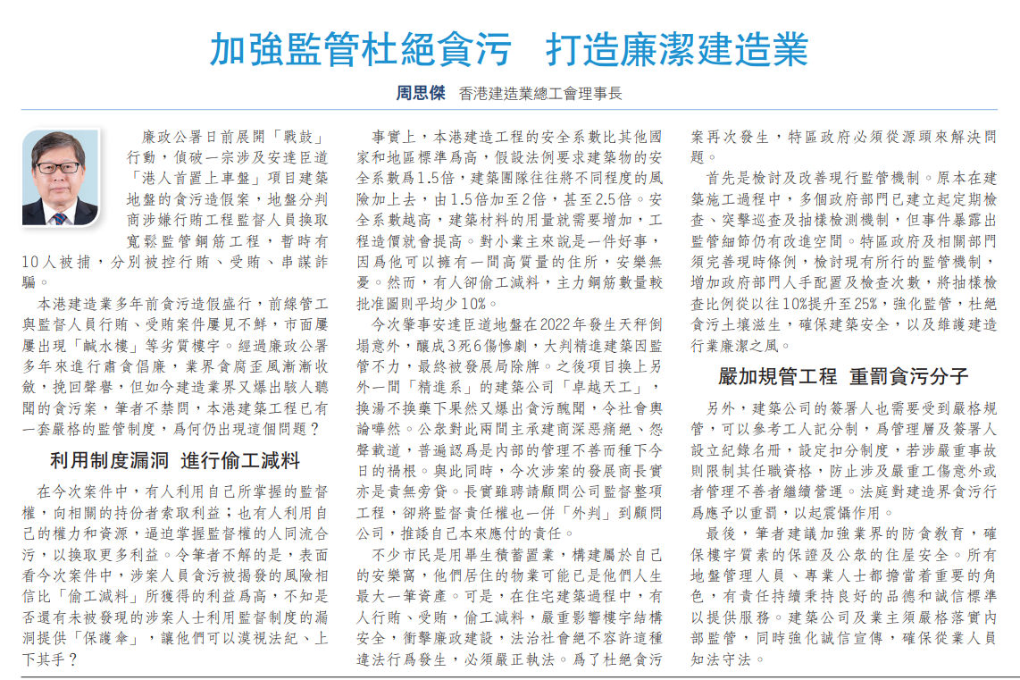 最后,笔者建议加强业界的防贪教育,确保楼宇质素的保证及公众的住屋安全。所有地盘管理人员、专业人士都担当着重要的角色,有责任持续秉持良好的品德和诚信标准以提供服务。建筑公司及业主须严格落实内部监管,同时强化诚信宣传,确保从业人员知法守法。