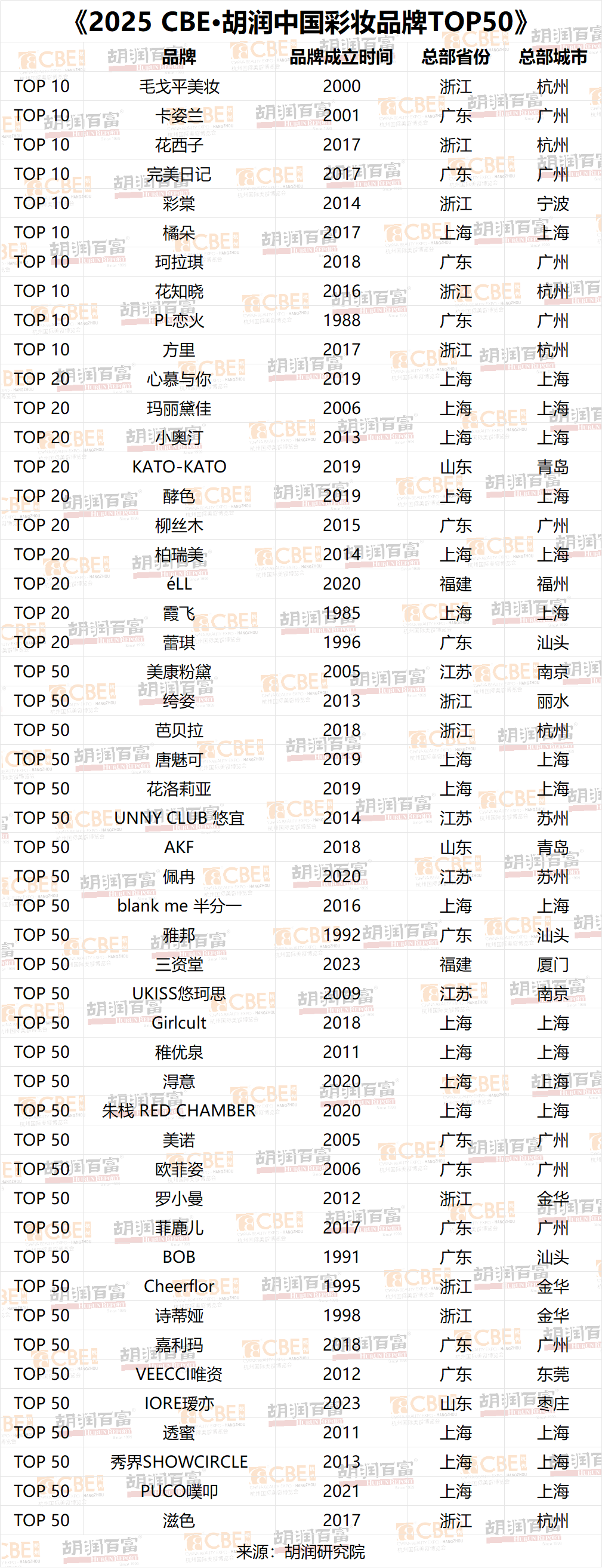 2025 CBE·胡润中国彩妆品牌TOP50,2025 CBE·胡润中国美妆原料企业