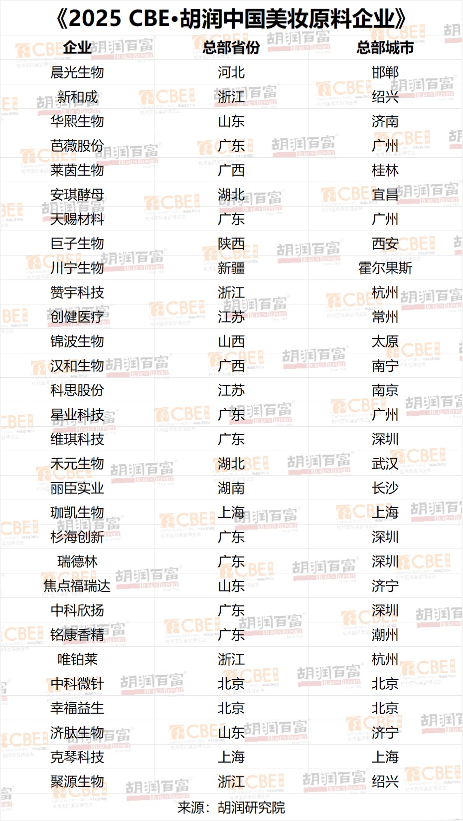 晨光生物、新和成、华熙生物等入选《2025 CBE·胡润中国美妆原料企业》