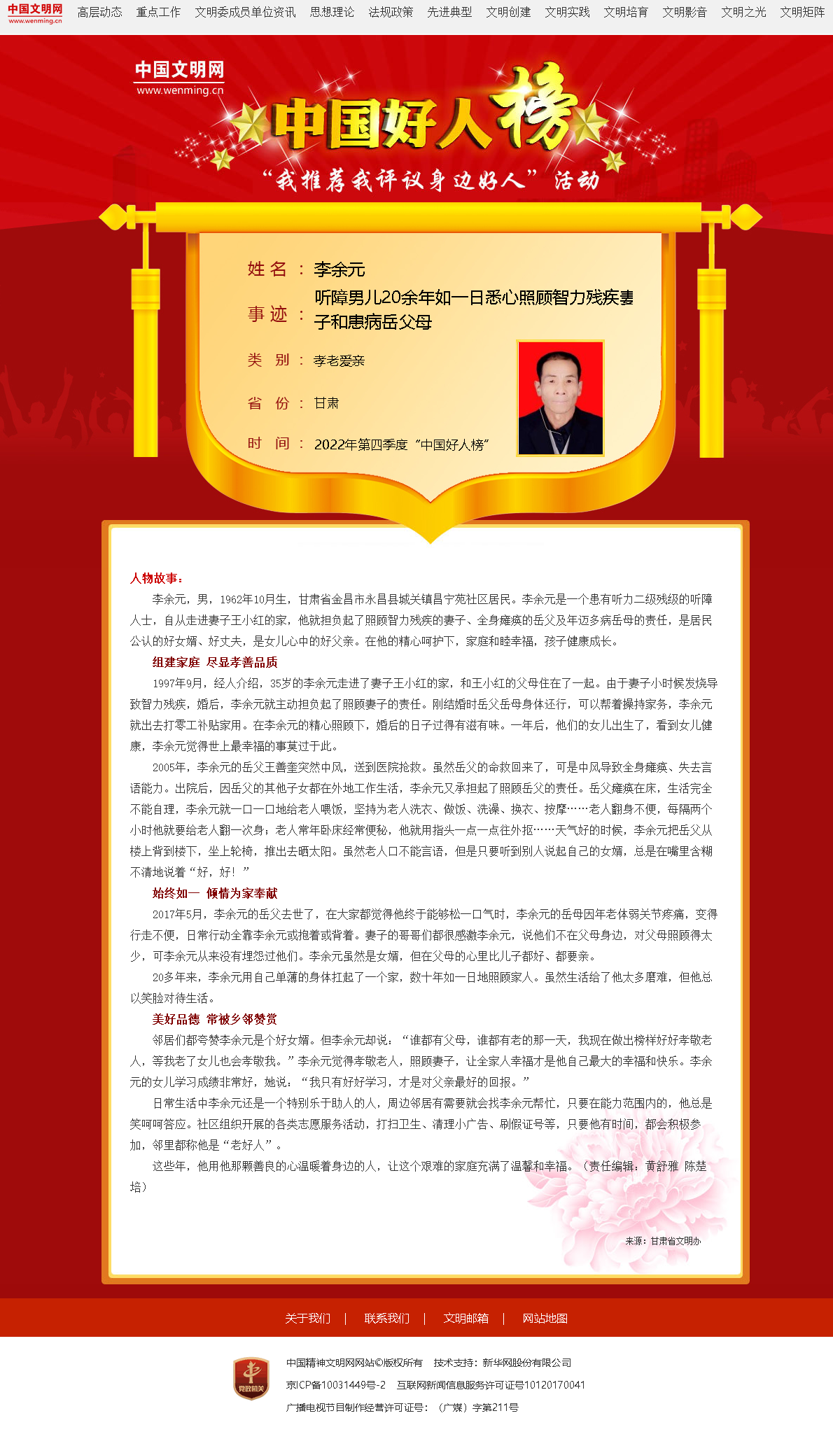 2022年“中国好人榜”系列报道 李余元:用真心真情意扛起温暖的家