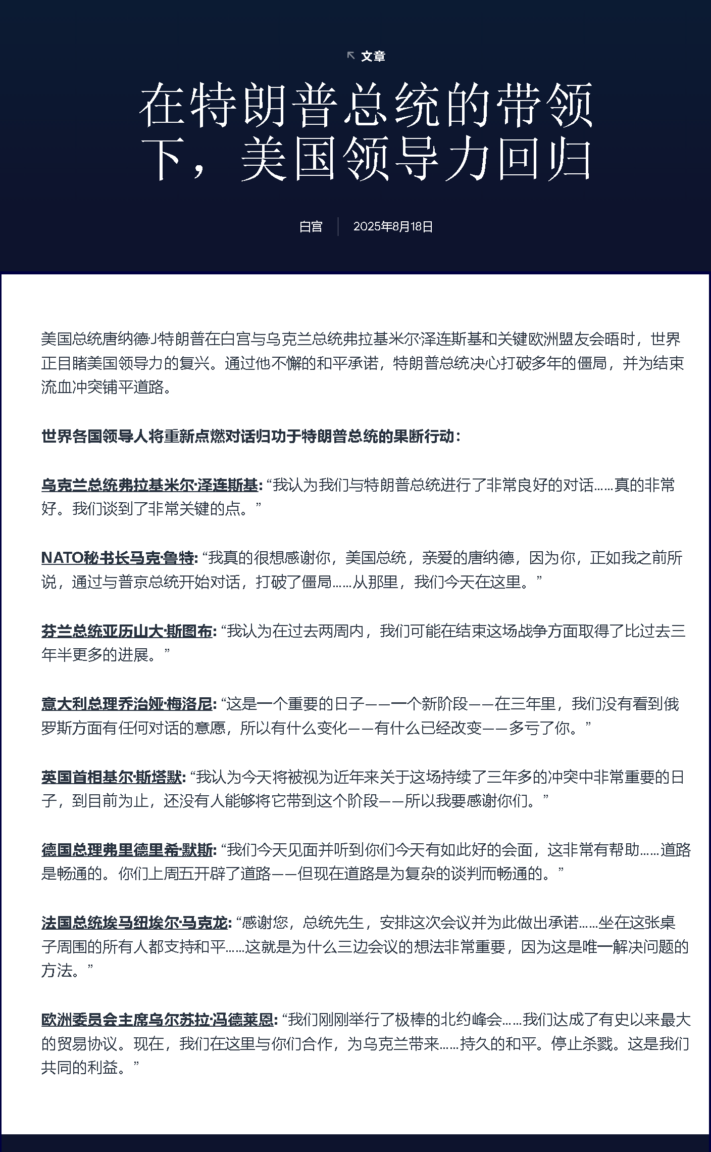 美国总统唐纳德·J·特朗普在白宫与乌克兰总统弗拉基米尔·泽连斯基和关键欧洲盟友会晤时,世界正目睹美国领导力的复兴。通过他不懈的和平承诺,特朗普总统决心打破多年的僵局,并为结束流血冲突铺平道路。