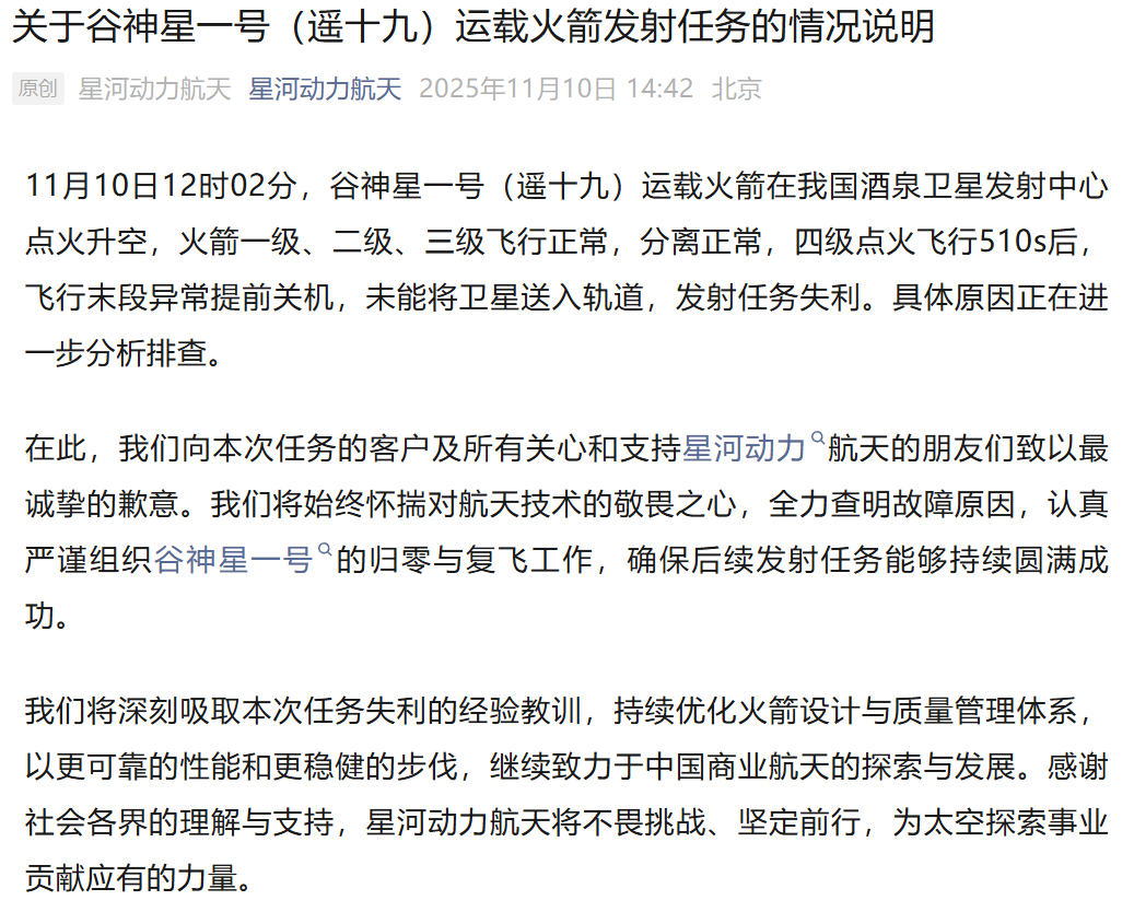新华社酒泉11月10日电 11月10日12时02分,我国在酒泉卫星发射中心使用谷神星一号民营商业运载火箭发射吉星高分04C星,并搭载发射吉星平台02A04星、中北大学一号卫星,火箭飞行异常,卫星未能进入预定轨道,发射任务失利。具体原因正在进一步分析排查。