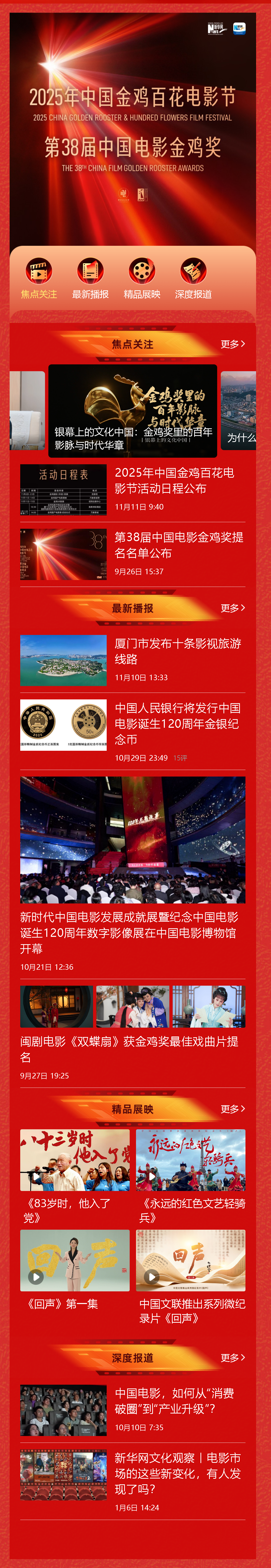 11月1日起,作为主办城市的厦门推出2025年金鸡百花电影生活季,通过举办中外电影影展、推出10条影视旅游线路、1节电影主题地铁车厢、1艘主题游轮和16处金鸡衍生品线下销售点等方式,推动影视与文旅、餐饮、商贸等深度融合,打造“电影走进生活,生活充满电影”的城市文旅体验。