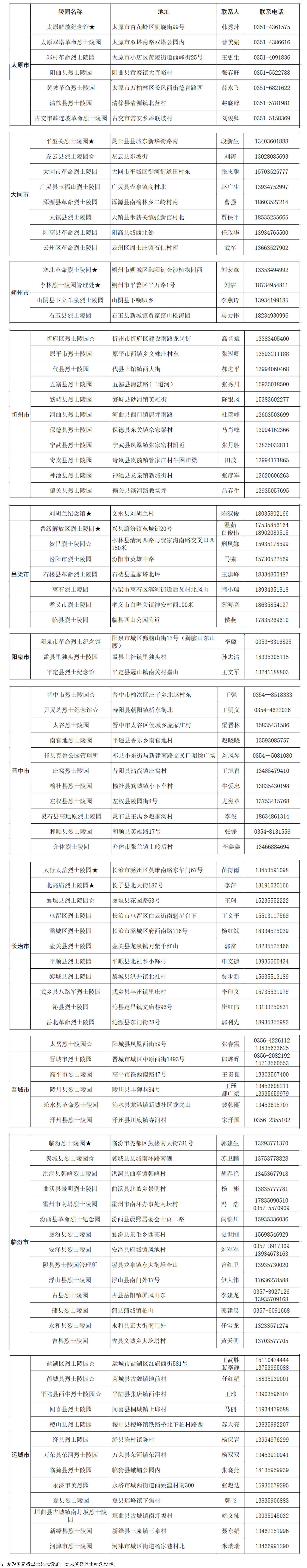 黄河新闻网讯(记者周昱丽)清明将至,为方便社会各界赴烈士陵园祭扫,近日,山西省退役军人事务厅发布我省各地主要烈士纪念设施名单、联系方式,以及祭奠仪式一般流程和注意事项。