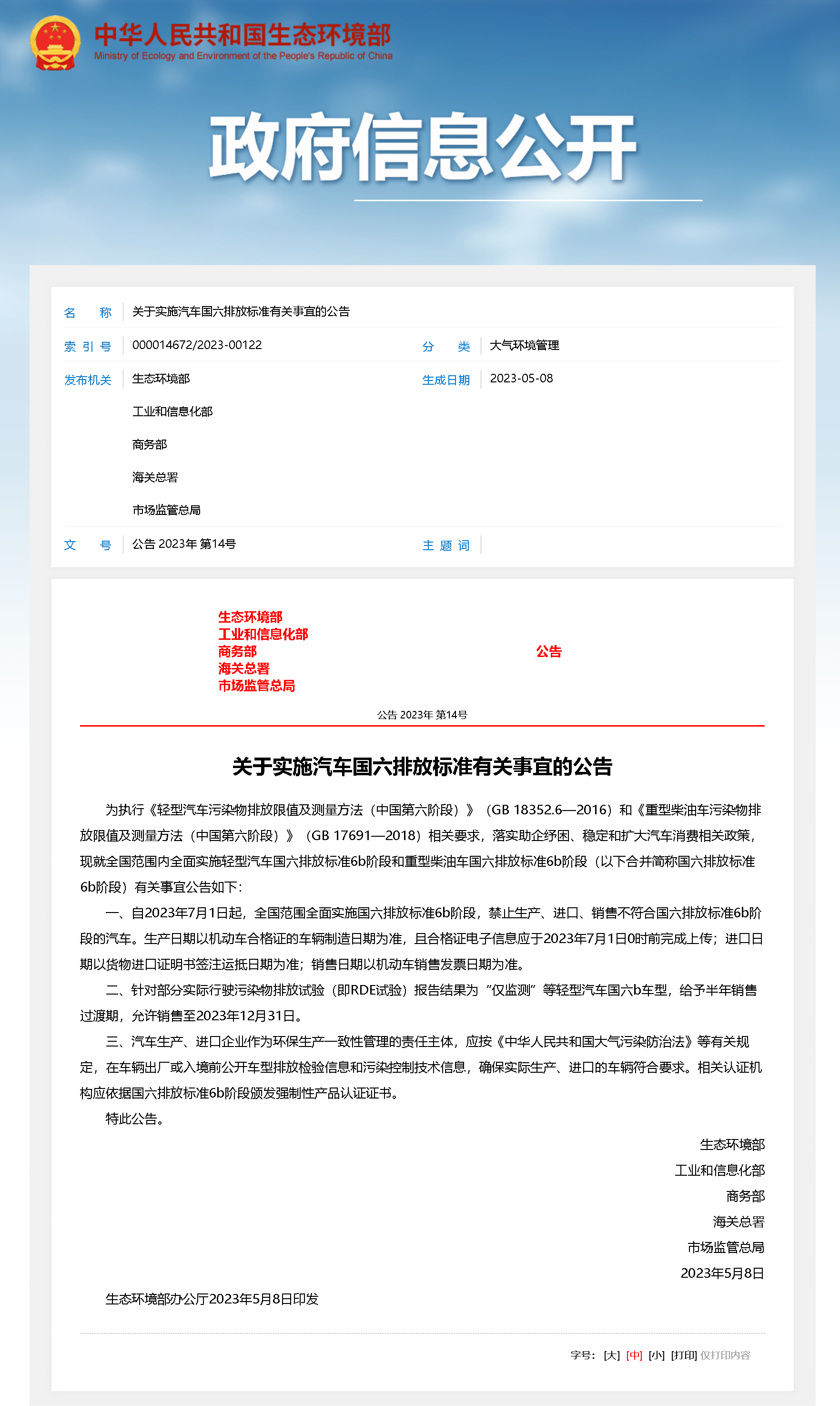 根据生态环境部、工信部、商务部、海关总署、市场监管总局日前联合发布的公告,本次汽车排放标准提升包括轻型汽车和重型柴油车。生产日期以机动车合格证的车辆制造日期为准,且合格证电子信息应于2023年7月1日0时前完成上传;进口日期以货物进口证明书签注运抵日期为准;销售日期以机动车销售发票日期为准。