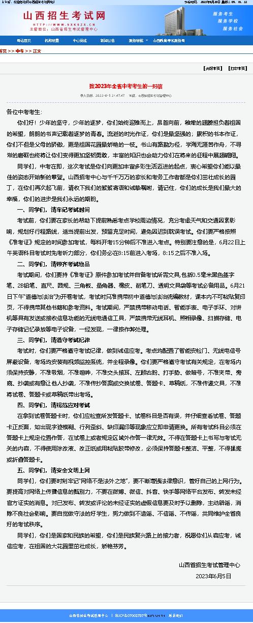 山西省2023年中考时间为6月20日、21日、22日。记者6月19日从山西省招考中心获悉,今年全省中考报名356516人,比去年减少27708人,全省共设11个考区、353个考点、11944个考场。