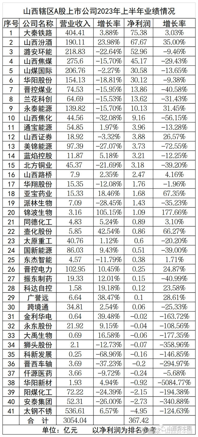 以下为山西41家A股上市公司业绩情况(以净利润为排名参考):