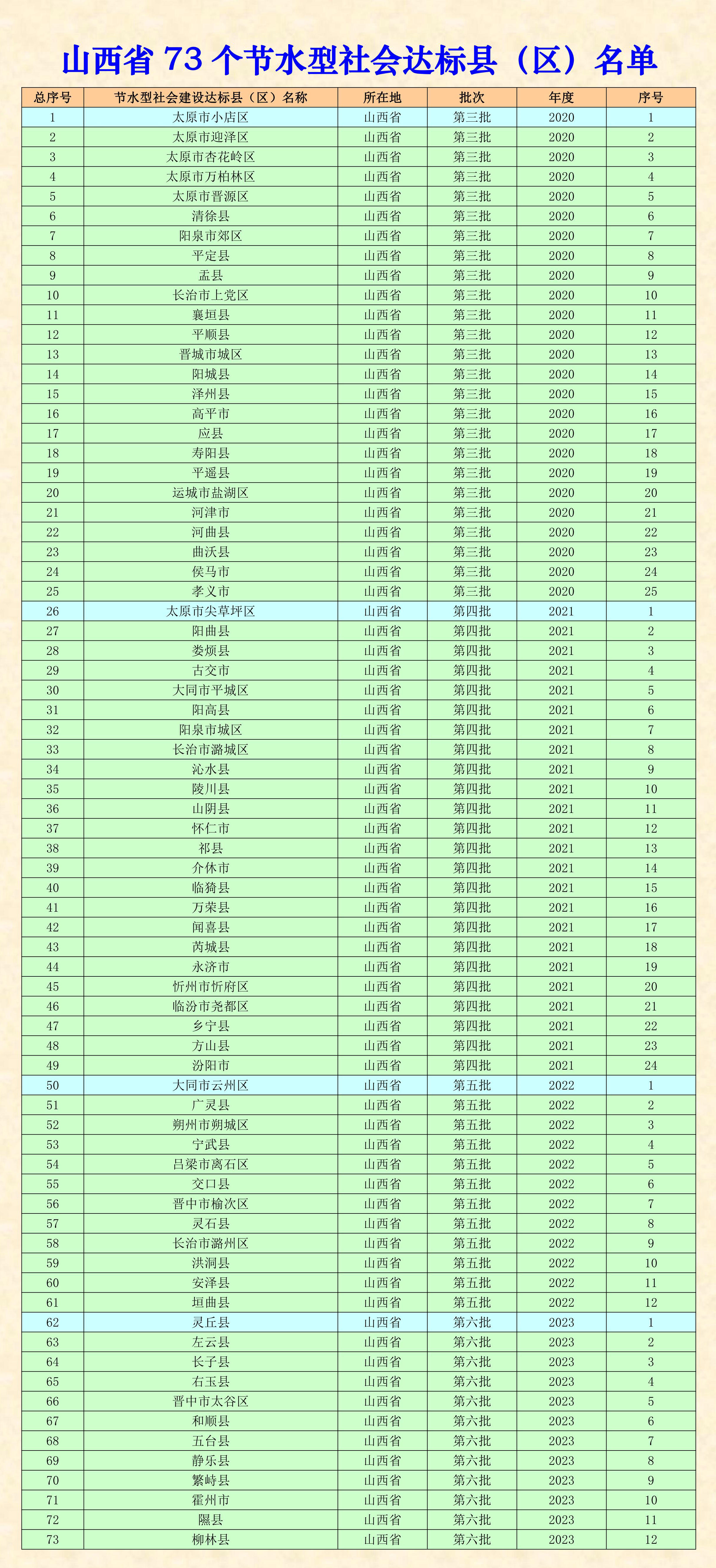 山西省73个节水型社会达标县(区)名单