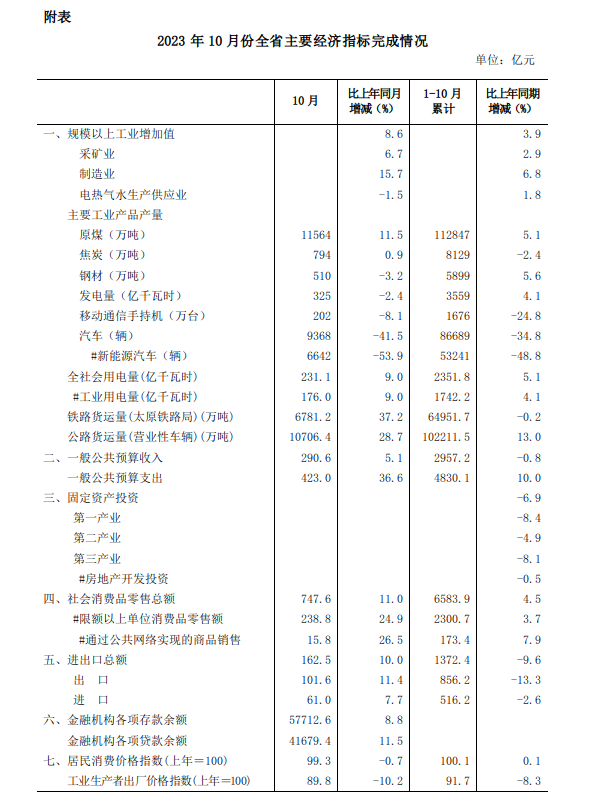 能源保供扎实推进。全省持续加大生产力度,实现了煤、气、电持续安全稳定供应。全省规上原煤产量112846.5万吨,增长5.1%;规上非常规天然气产量增长9.4%;发电量增长4.1%,其中外送电量增长8.4%。