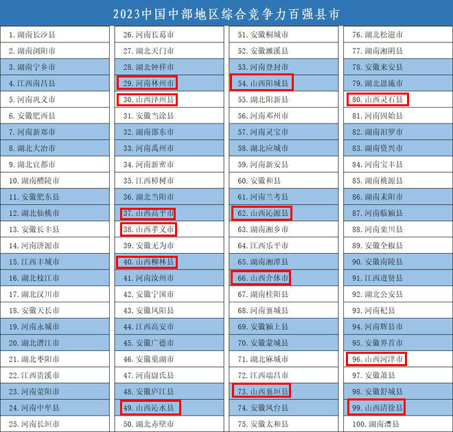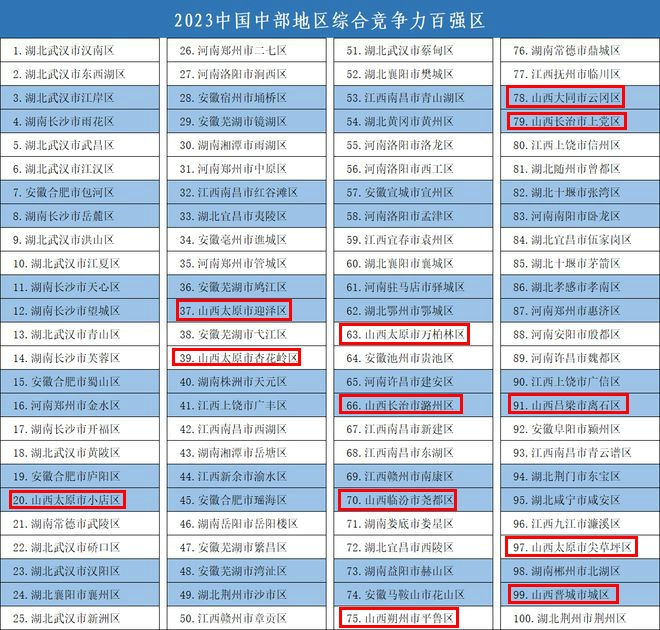 近日,竞争力智库等机构在北京发布《中国县域发展监测报告2023》,揭晓“2023中国综合竞争力百强县市”等名单,太原市清徐县入围“2023中国中部地区综合竞争力百强县市”,太原市小店区、迎泽区、杏花岭区、万柏林区、尖草坪区入围“2023中国中部地区综合竞争力百强区”。