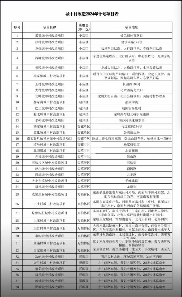 4月9日,一张关于《城中村改造2024年计划项目表》不胫而走。其中包含了亲贤村、狄村、龙保村、西峰村等38个城改项目,囊括了小店区、迎泽区、杏花岭区、尖草坪区、万柏林区和晋源区六大主城区。