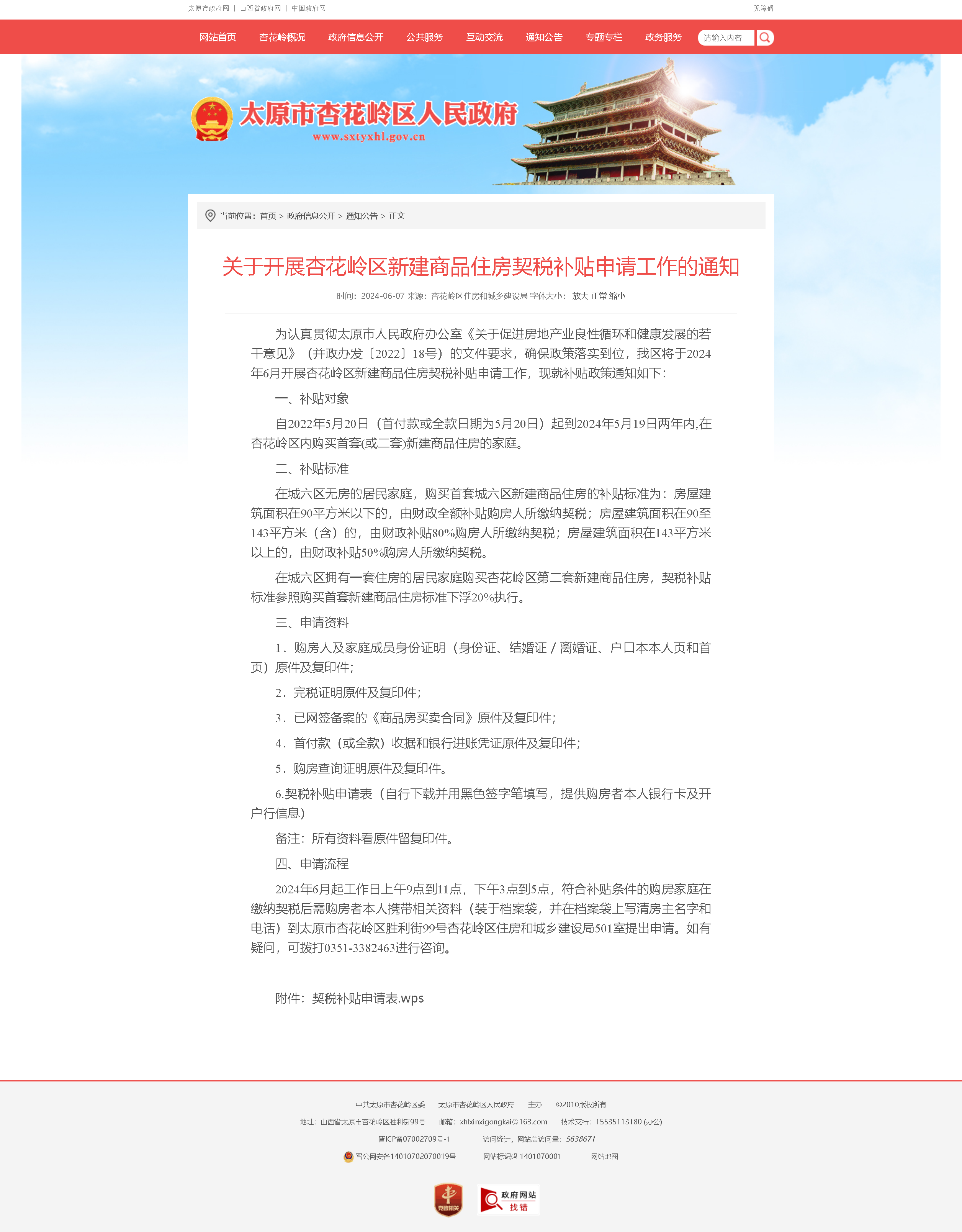 山西晚报讯(记者 柴旭晖)近日,太原市杏花岭区人民政府官方网站发布《关于开展杏花岭区新建商品住房契税补贴申请工作的通知》(以下简称《通知》),对在杏花岭区内购买首套(或二套)新建商品住房的家庭进行契税补贴。