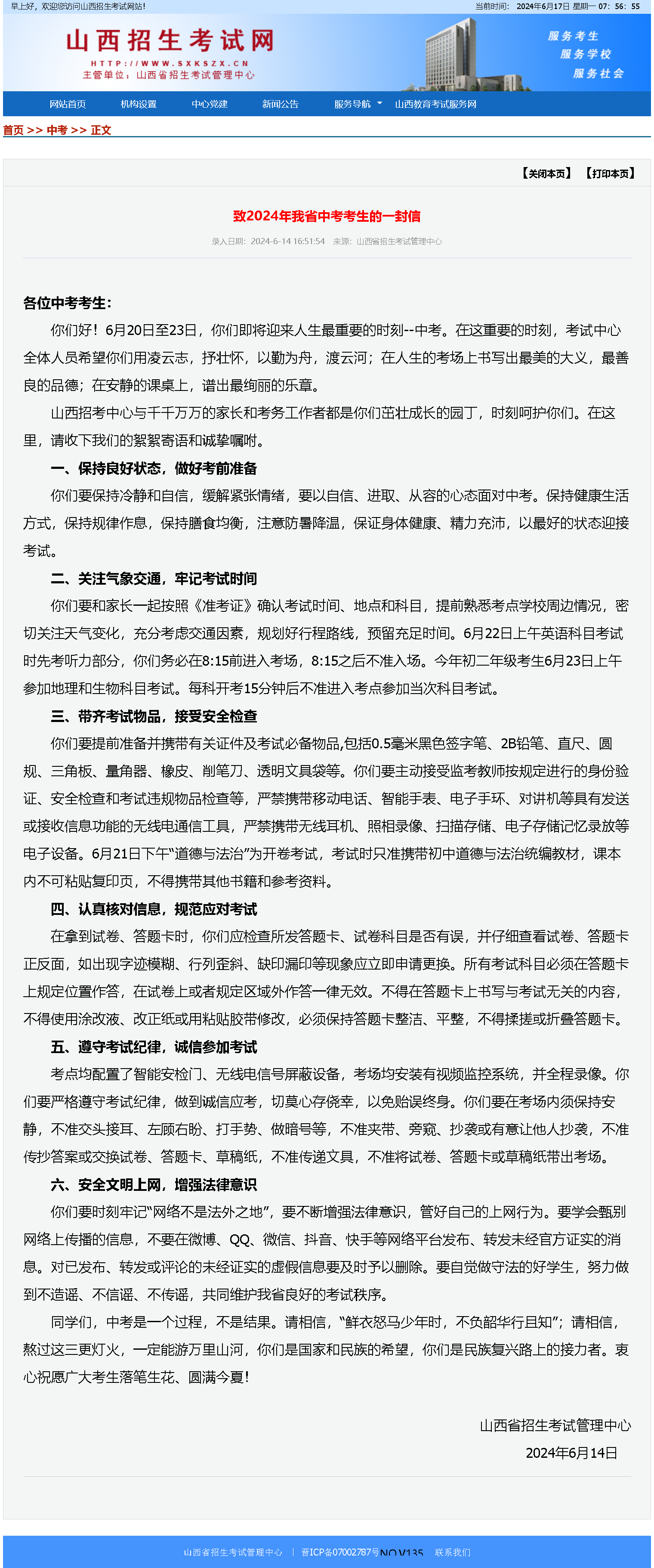 黄河新闻网讯(记者周昱丽)6月14日,山西省招考中心发布《致2024年我省中考考生的一封信》。节选如下: