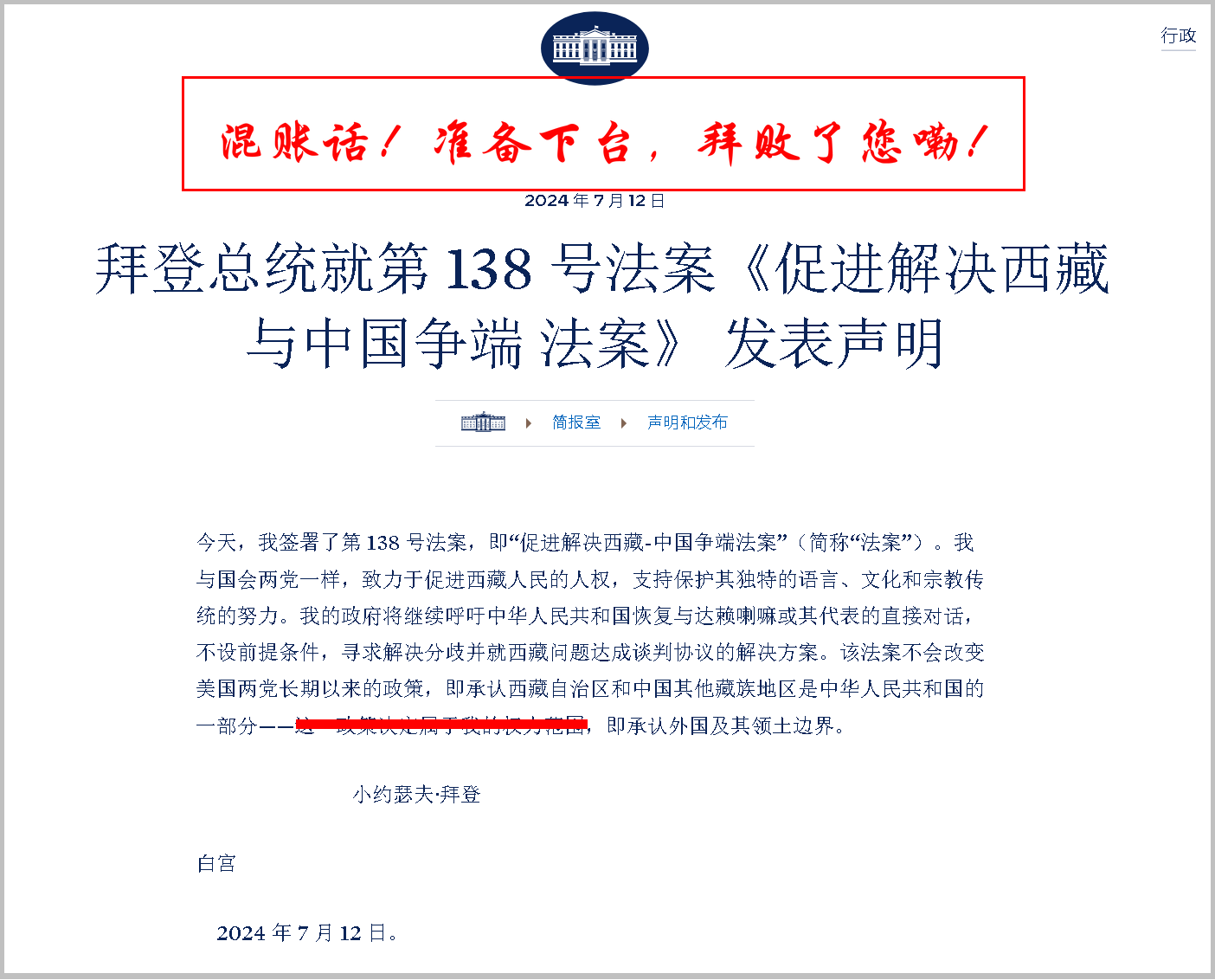 今天,拜登又上演了一幕丑剧,在下台前翻箱底找出来个“西藏法案”,企图扰乱国际视线,缓解美国选民包括民主党在内呼吁其退选形成的巨大精神压力,顾左右而言他,拿中国说事,以壮其胆!