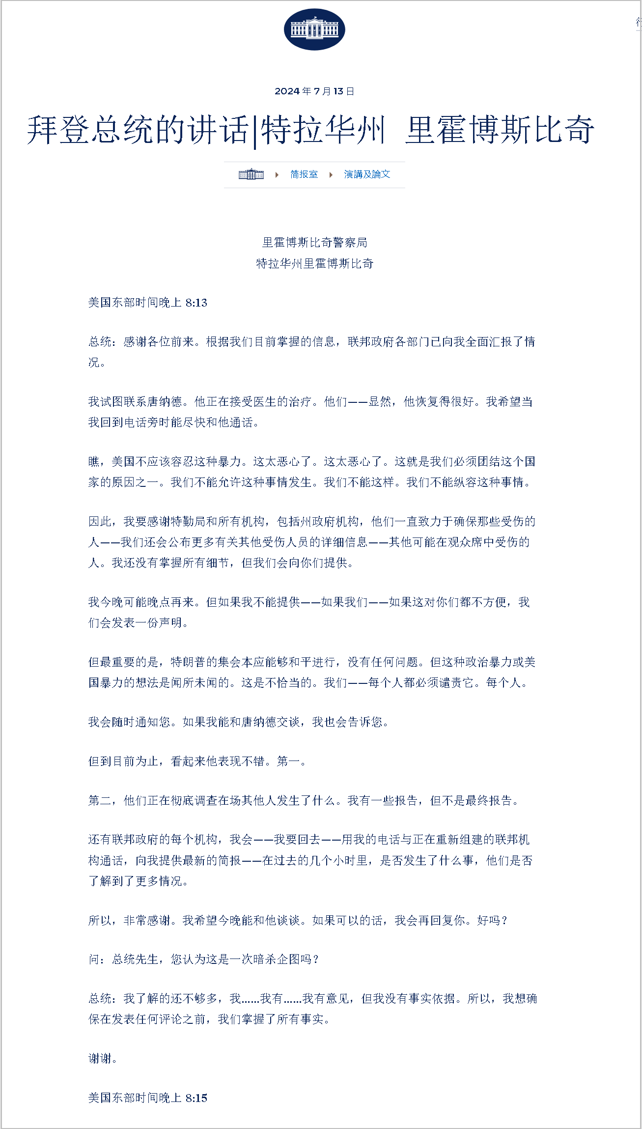 “吉尔和我感谢特勤人员把他(特朗普)带到了安全的地方。在美国,这种暴力没有立足之地。我们必须团结起来,作为一个国家来谴责它。”
