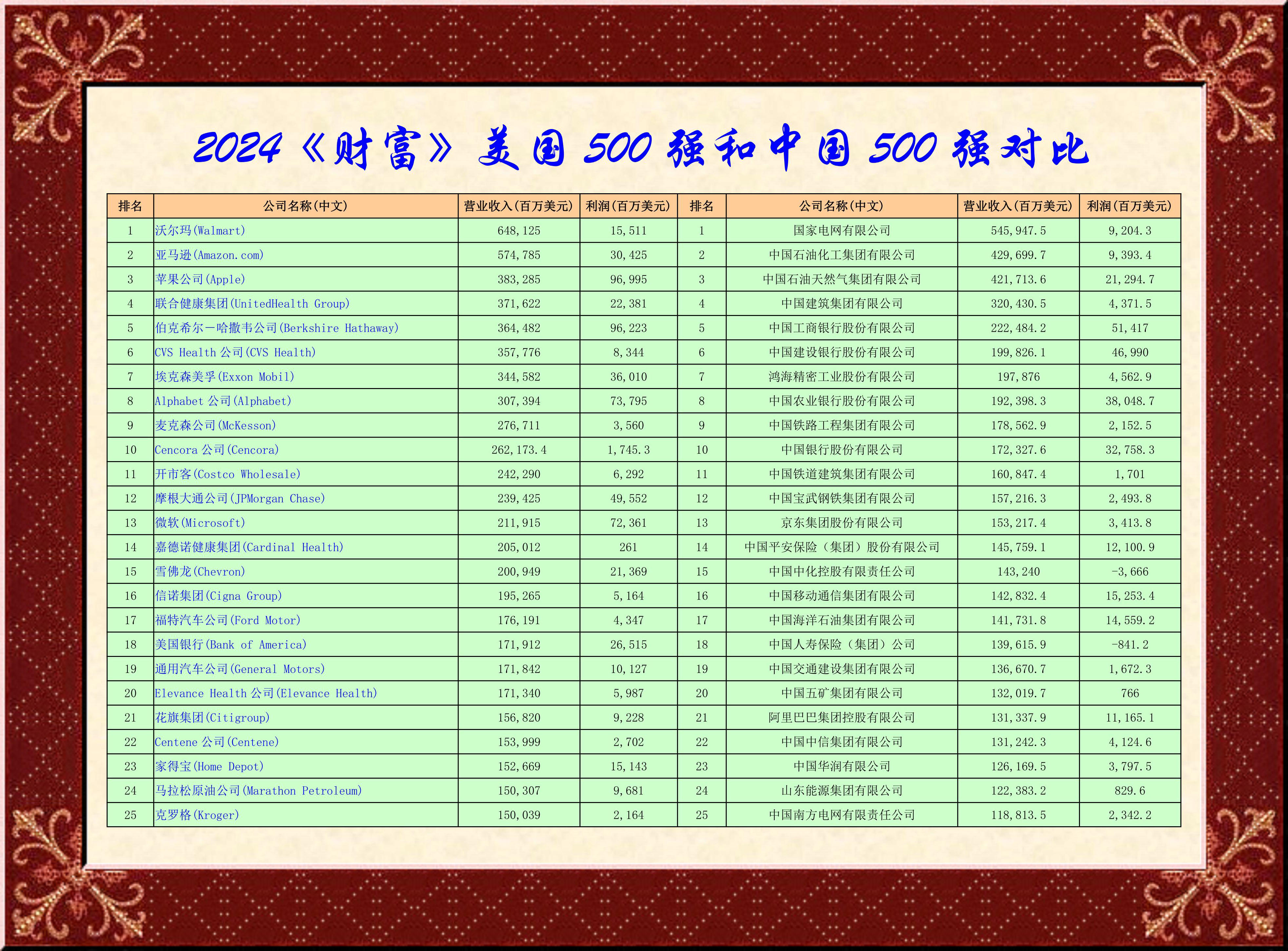 今天,把《财富》美国500强和《财富》中国500强两个榜单合并,一对一排列,对号入座,公平合理,应无异意!