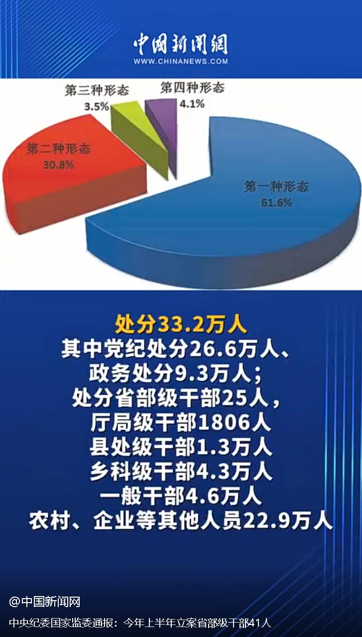 各级纪检监察机关运用“四种形态”批评教育和处理纪检监察干部1.04万余人次。其中,运用第一种形态批评教育和处理8377人次,运用第二种形态处理1515人次,运用第三种形态处理296人次,运用第四种形态处理293人。