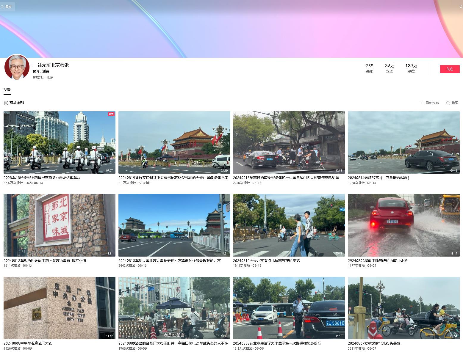 这位慈眉善目可爱的老张,看来是退休了。自己给自己找了一份工作,开车路拍首都北京街景。从2020年4月16日开始,到今天2024年8月19日,五年中1588天里拍了1489集。