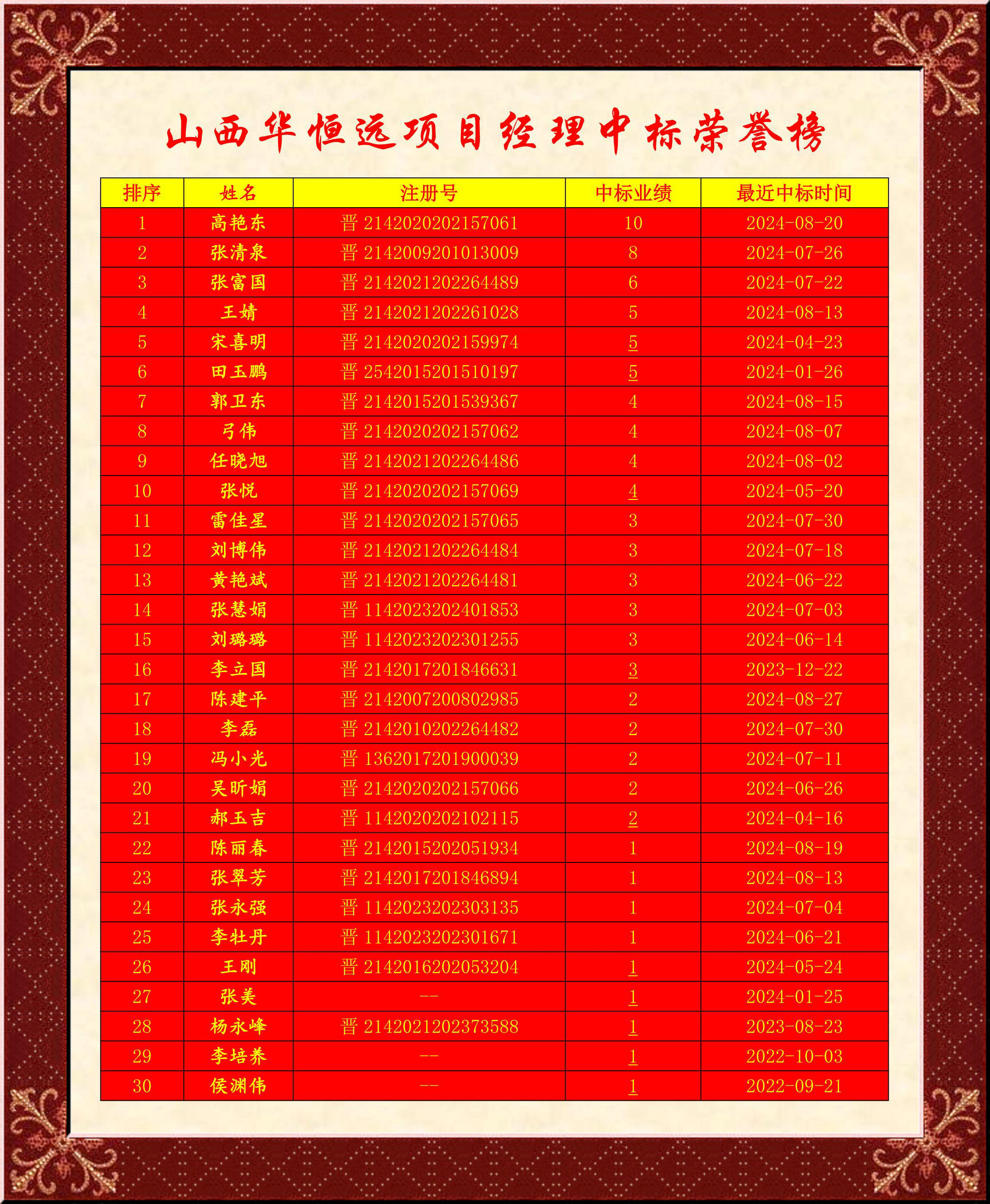 山西太阳成tyc7111cc官网项目经理中标荣誉榜