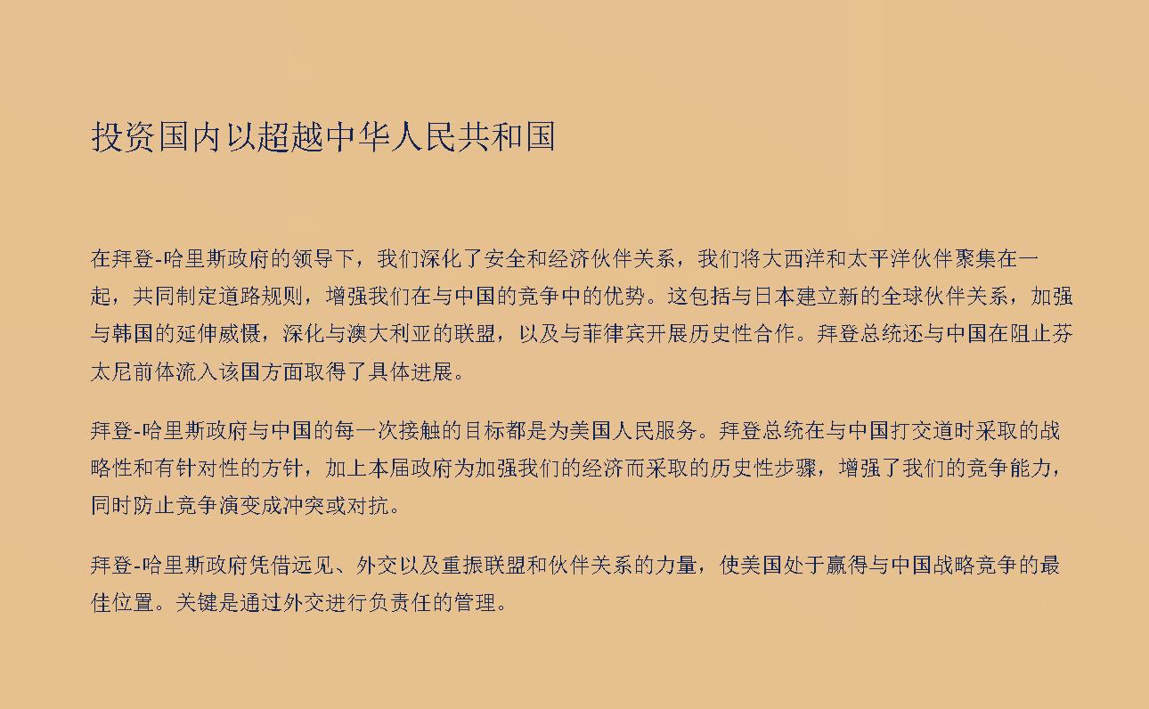 拜登-哈里斯政府与中国的每一次接触的目标都是为美国人民服务。拜登总统在与中国打交道时采取的战略性和有针对性的方针,加上本届政府为加强我们的经济而采取的历史性步骤,增强了我们的竞争能力,同时防止竞争演变成冲突或对抗。