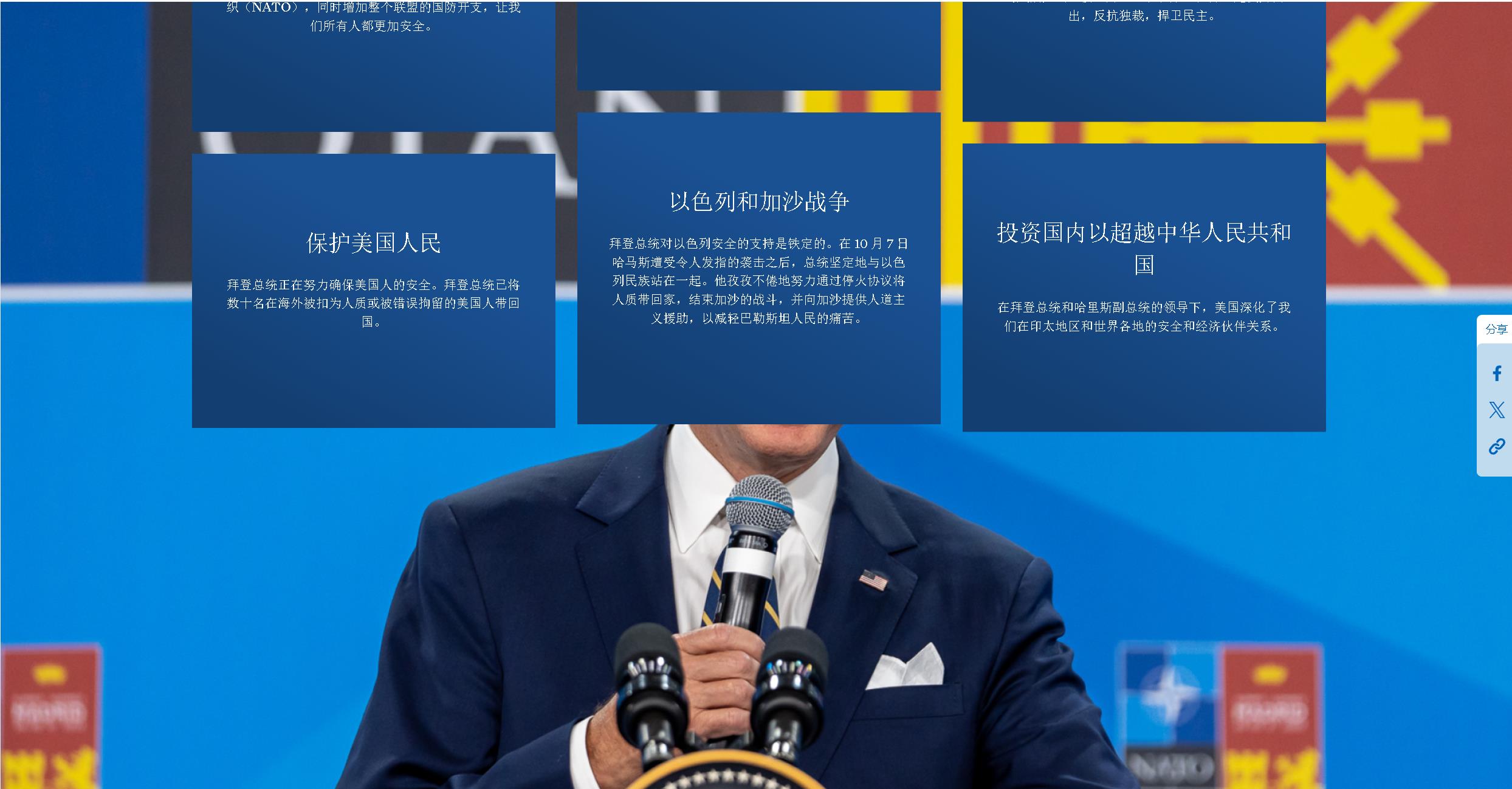 在拜登-哈里斯政府的领导下,我们深化了安全和经济伙伴关系,我们将大西洋和太平洋伙伴聚集在一起,共同制定道路规则,增强我们在与中国的竞争中的优势。这包括与日本建立新的全球伙伴关系,加强与韩国的延伸威慑,深化与澳大利亚的联盟,以及与菲律宾开展历史性合作。拜登总统还与中国在阻止芬太尼前体流入该国方面取得了具体进展。