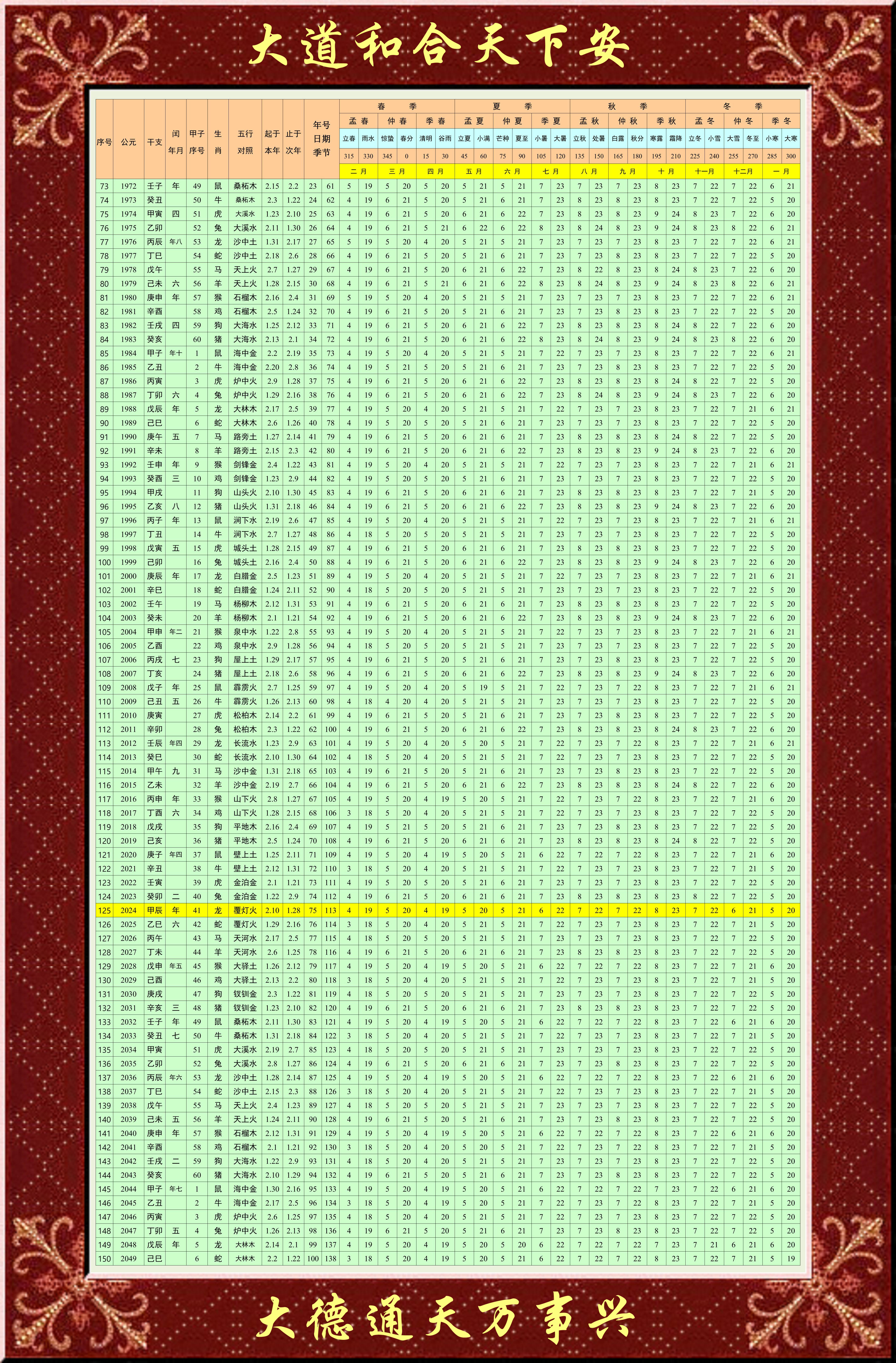 今天重新发布经过修正后的《一百五十年一年四季二十四节气》二表,目的是从中感应世界和人类社会在轮回中的变化,哪些年份风调雨顺五谷丰登,哪些年份大自然会发生灾难,达到先知先觉预见未来,这是一门科学中的科学,超越时间空间的大学问,希望有缘人能够达到通灵的高超境界!