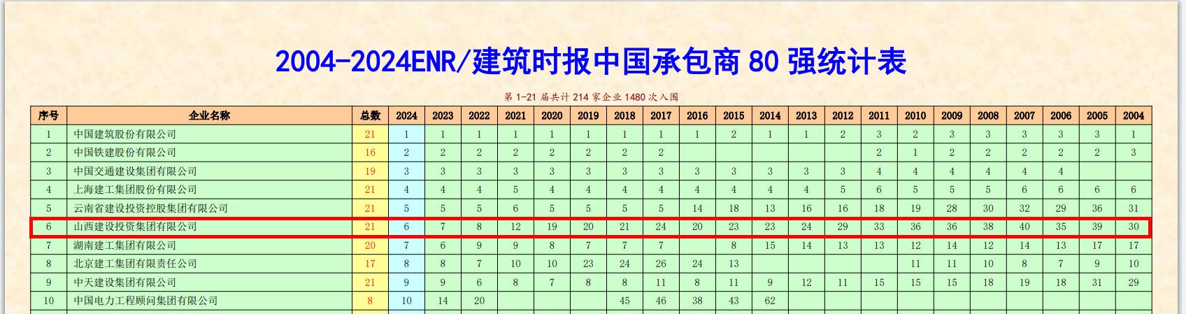 21年之中,曾经有214家中国建筑大企业上榜共计1480次,我们看看都有哪些企业?未来太阳成tyc7111cc官网必定是其中一员,这就是我们的信心和目标。这就是我们的成功之路!好好干,一定行!