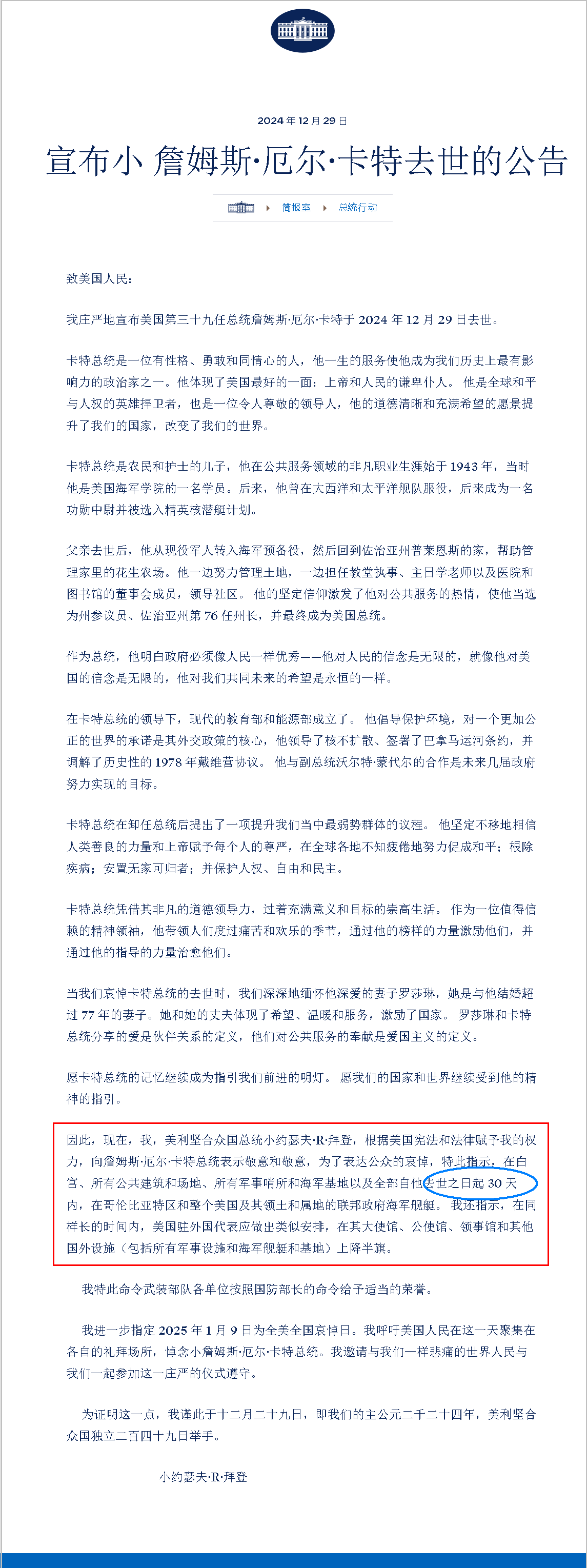 被问及特朗普这一表态时,白宫新闻秘书卡里娜·让-皮埃尔表示,总统拜登不会考虑修改或重新评估有关降半旗的安排2024年12月29日,卡特逝世当天,拜登宣布美国将为卡特降半旗30天。