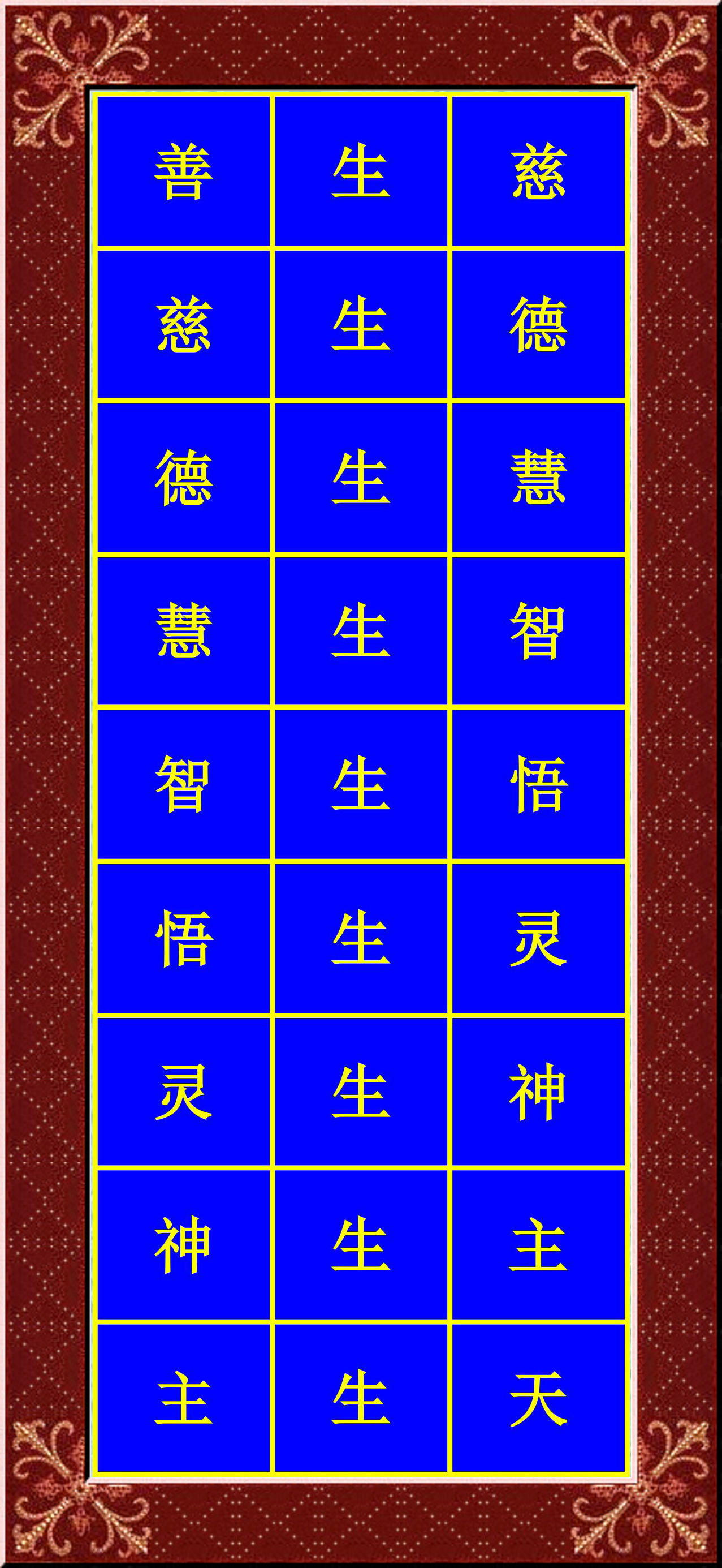 善生慈 慈生德 德生慧 慧生智 智生悟 悟生灵 灵生神 神生主 主生天