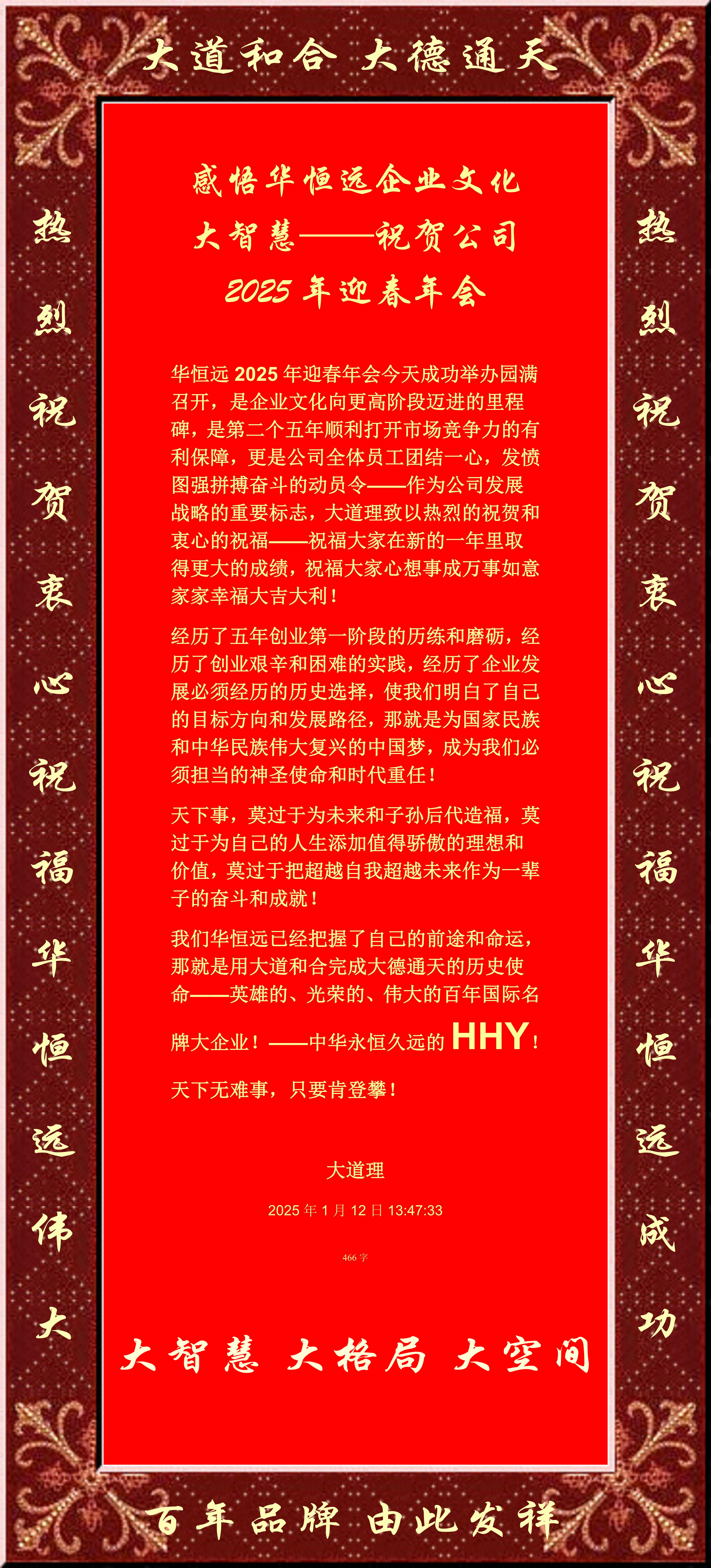 我们太阳成tyc7111cc官网已经把握了自己的前途和命运,那就是用大道和合完成大德通天的历史使命——英雄的、光荣的、伟大的百年国际名牌大企业!——中华永恒久远的HHY!
