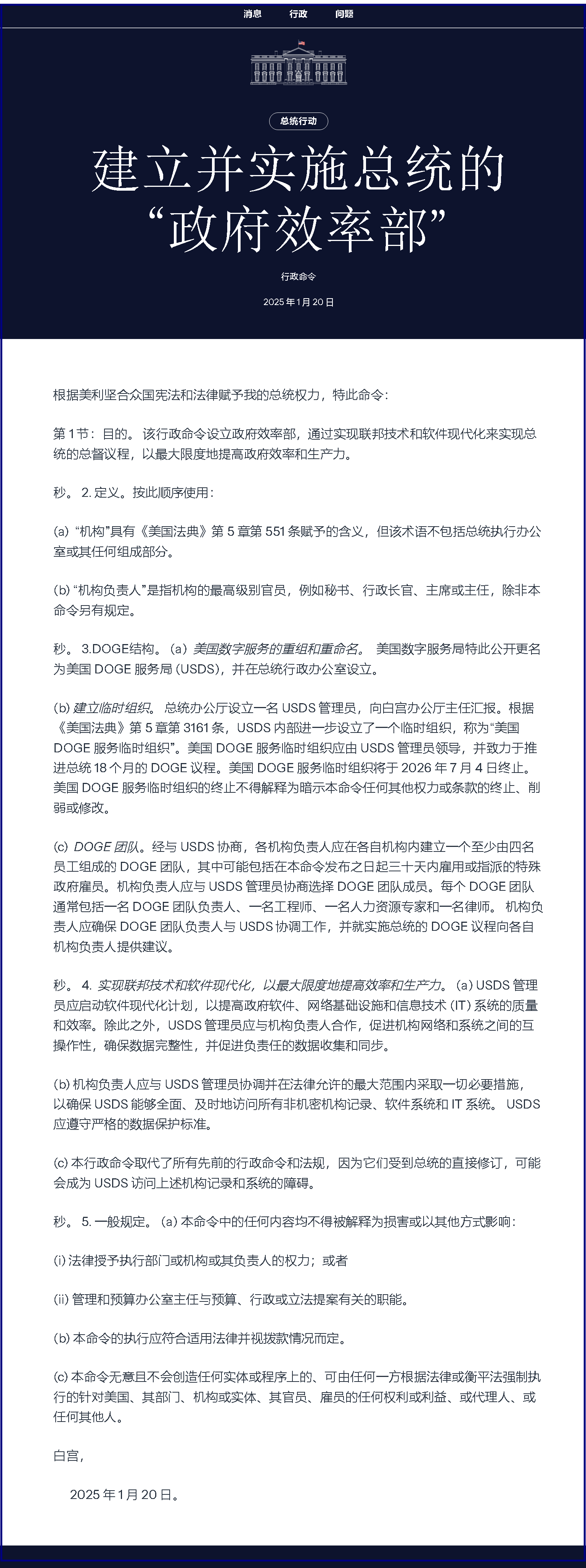第 1 节:目的。 该行政命令设立政府效率部,通过实现联邦技术和软件现代化来实现总统的总督议程,以最大限度地提高政府效率和生产力。
