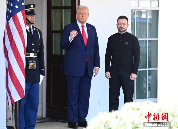 当地时间2月28日,华盛顿,美国总统特朗普与乌克兰总统泽连斯基在白宫会晤时发生争吵,不欢而散。图为特朗普在白宫迎接泽连斯基抵达。中新社记者 陈孟统 摄