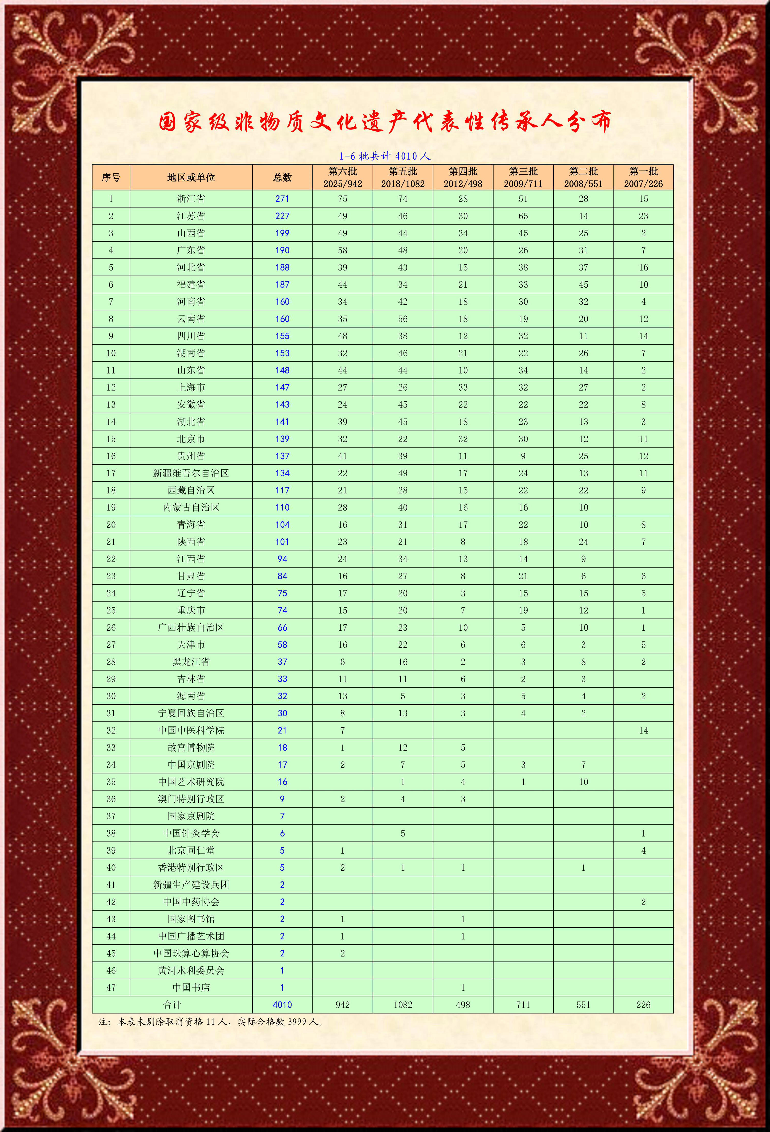2007年第一批226个/人、2008年第二批551个/人、2009年第三批711个/人、2012年第四批498个/人、2018年第五批1082个/人,2025年第六批942个/人,共计4010人