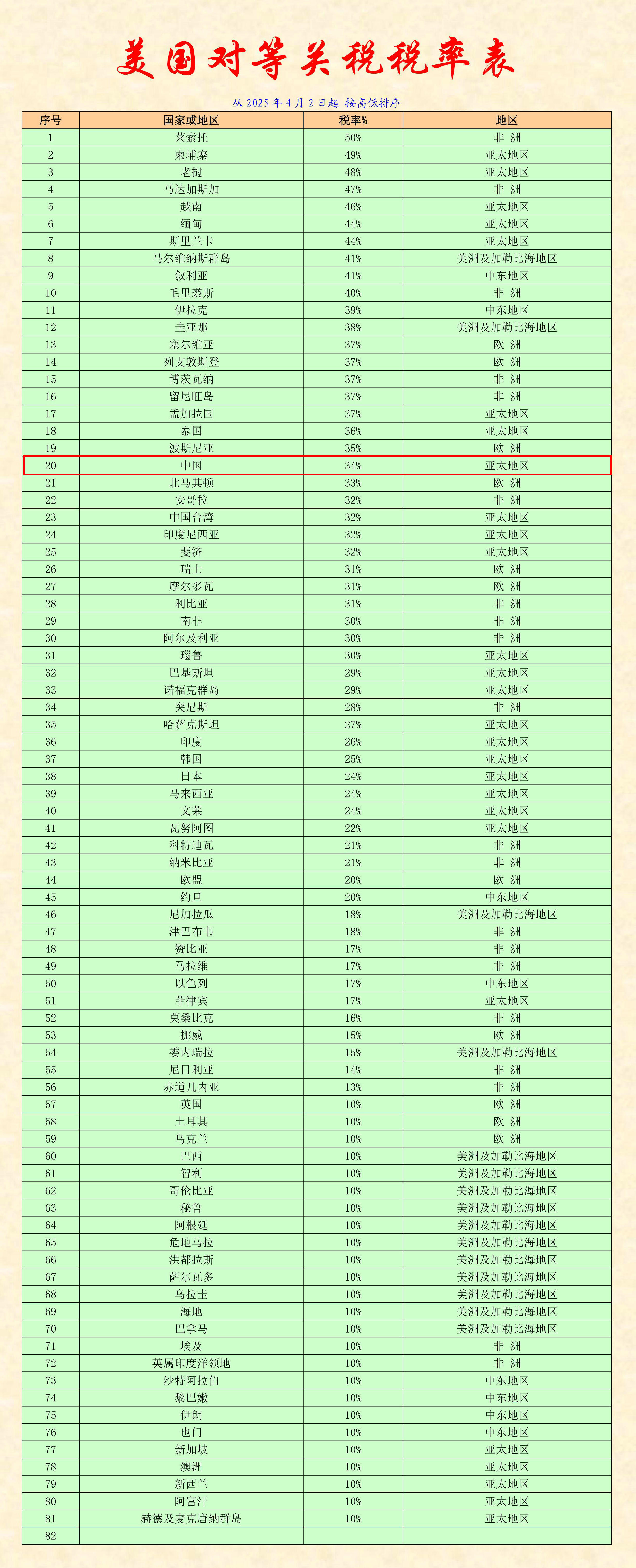 特朗普当日下午在白宫玫瑰园举行「让美国再次富裕」活动,将当天形容为美国的「解放日」。按照行政命令,美国对所有进口美国商品加征10%的基准关税,预计美东时间周六凌晨生效。至于针对部分国家征收的较高额关税税率,则于下周二凌晨生效。