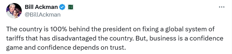 据美国有线电视新闻(CNN)报道,比尔·阿克曼是特朗普在华尔街的最大支持者之一,而过去几天里,这名“铁杆金主”在社媒X上已经多次发文反对特朗普的关税政策。
