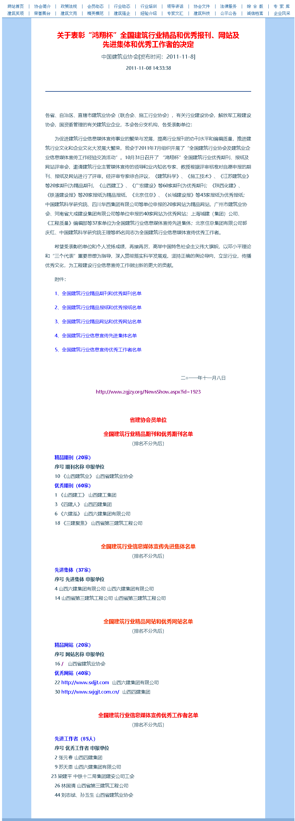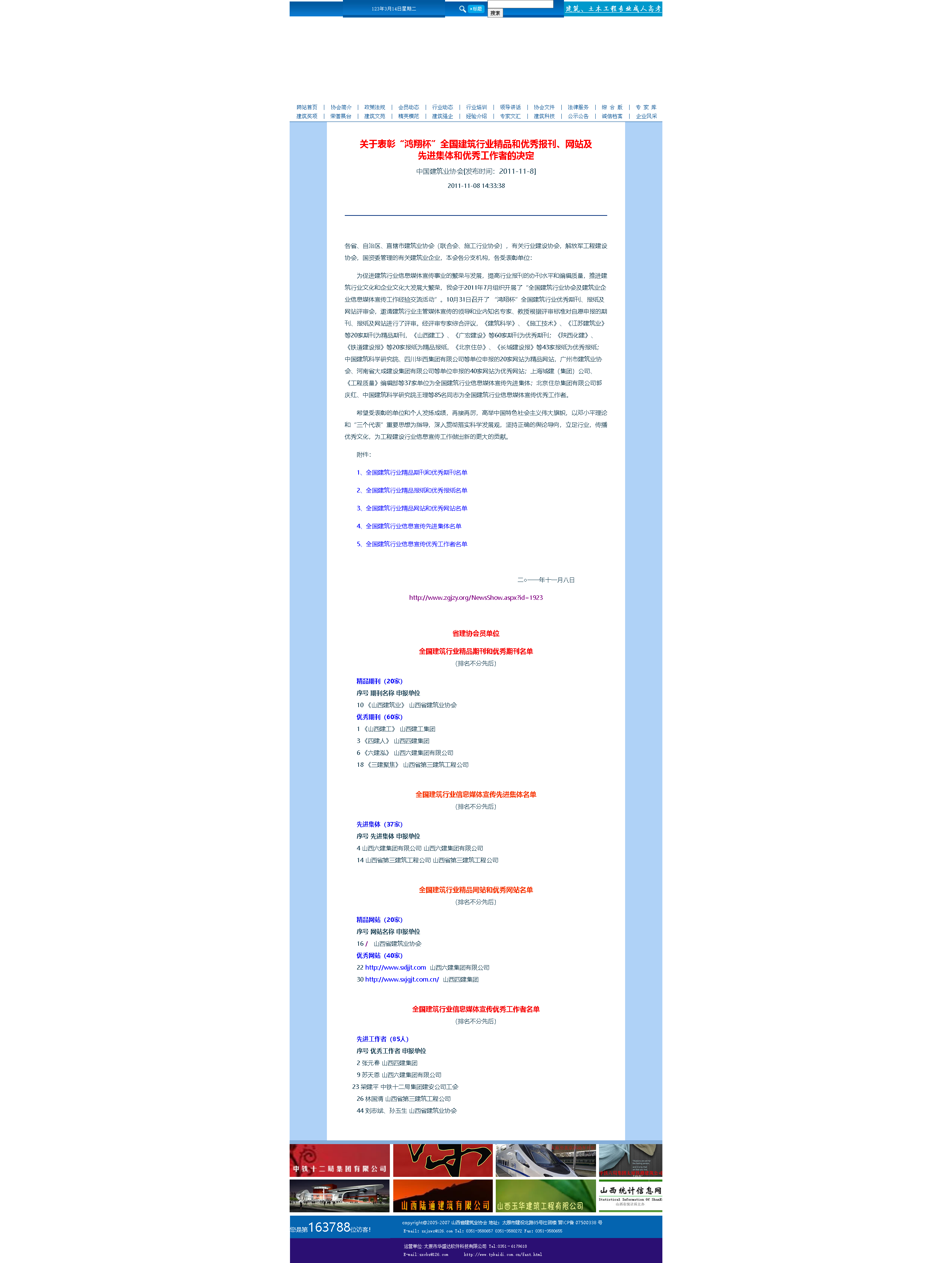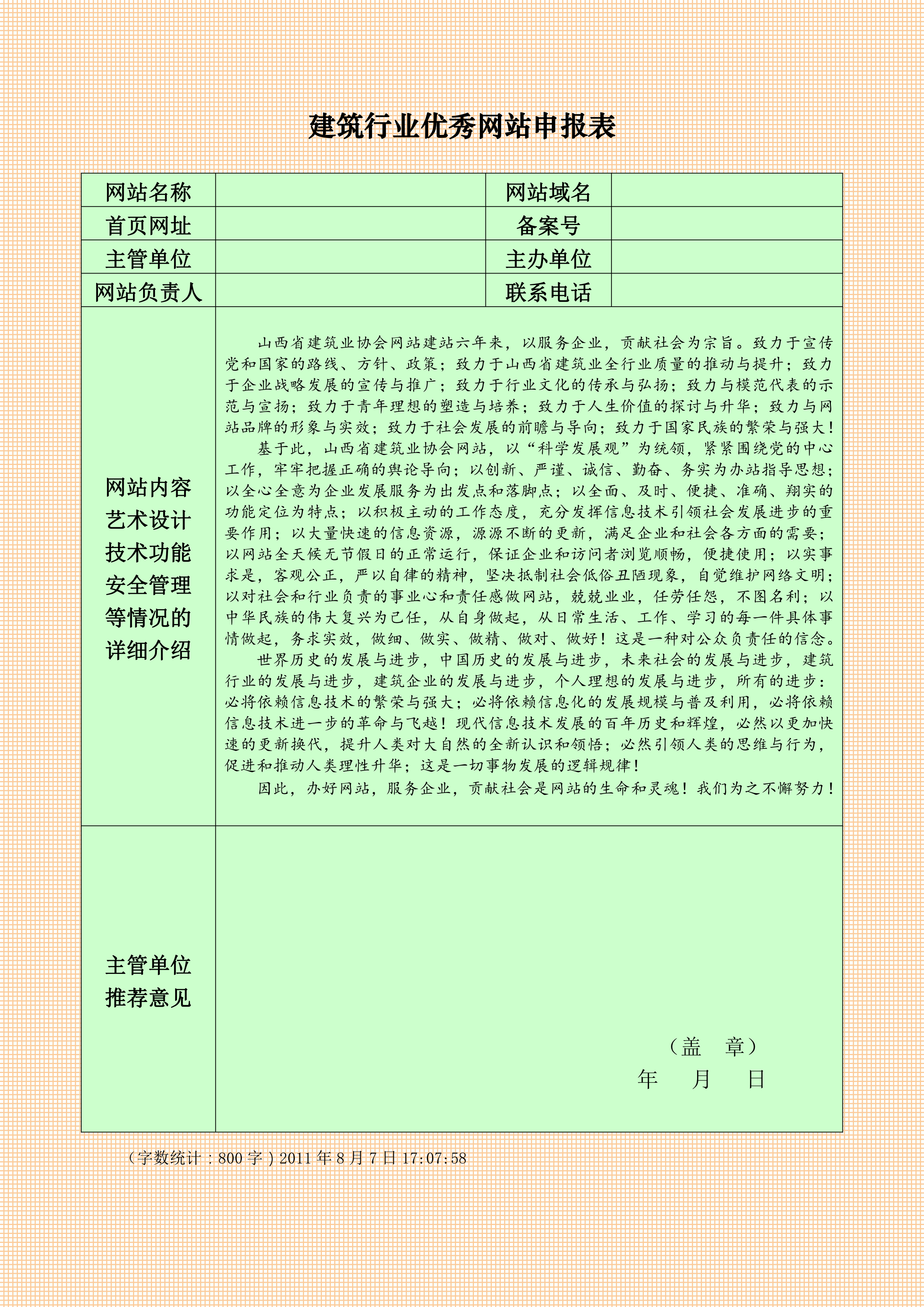 这是2011年在协会负责网站工作时,我亲自撰写的申报“全国建筑行业精品和优秀网站”的文稿,要求内容用五号楷体限制在800字。