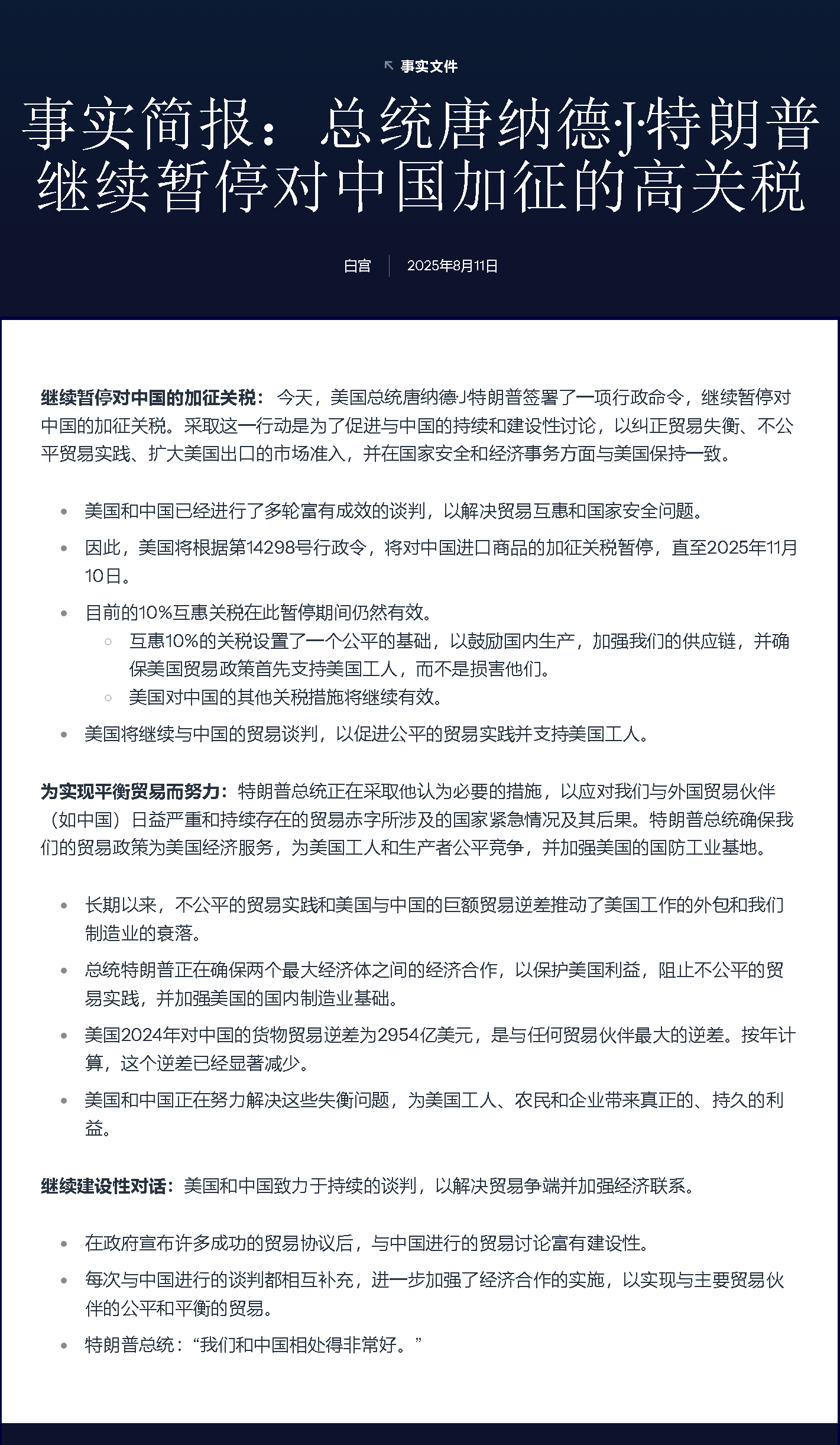美国继续与中华人民共和国进行对话,以解决我们在经济关系中的贸易互惠性不足问题,以及由此产生的国家安全和经济安全问题。通过这些对话,中华人民共和国继续采取重大措施,纠正非互惠贸易安排,并解决美国在经济和国家安全问题上的关切。基于这些新增信息和来自多位高级官员的建议,以及其他事项,我已决定有必要并将Executive Order 14298所实施的暂停措施延长至2025年11月10日东部标准时间凌晨12:01。